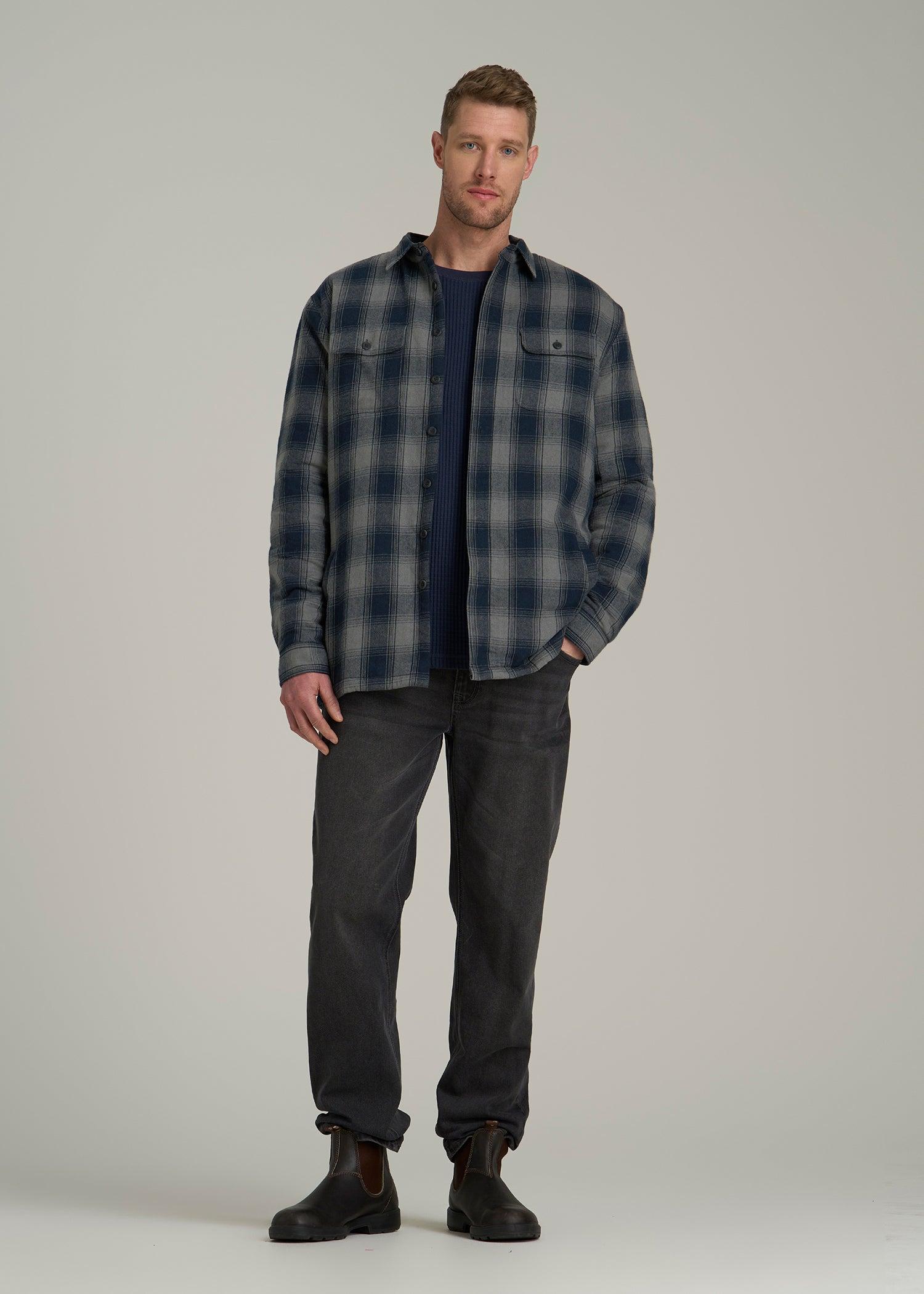 LJ&S Men's Sherpa Lined Shirt Jacket in Midnight Navy & Medium Grey Plaid. 100% Cotton exterior, 100% Polyester Sherpa lining, and smooth lined polyester quilted sleeves. Straight fit for a casual, relaxed look. Chest patch pockets, side welt pockets, and inside pocket with button closure. Point collar and button closure. Pleat detail and locker loop on the back. Pre-washed to control shrinkage. Supreme comfort, exceptional warmth, and it doesn't hurt that you'll look pretty stylish too. MORE DETAILS: Say hello to your new best friend during the colder months. When the chill hits, you need a jacket that's not only warm, but also capable. This Sherpa Lined Work Jacket is fully loaded with its unbeatably soft-hand feel, super cozy capabilities, and of course, pockets everywhere you could possibly need them. A classic LongJohn & Sons work jacket designed to do just that — work. Whether you're doing the daily grind at the jobsite or laboring at the campsite, this jacket delivers some serious comfort and warmth. Don't get us wrong, this jacket is great for lounging around the house and other leisurely activities as well. But we didn't name it a "work" jacket for no reason. SIZE & FIT: Relaxed-fitModel is 6'8", 230 lbs, wearing size L Tall FABRIC & CARE:100% Cotton Shell100% Polyester Sherpa lining / sleeves polyester quilt liningWash Care: Machine wash on cold, do not bleach. Tumble dry on low, low heat iron if needed.Midnight Navy & Medium Grey Plaid color
