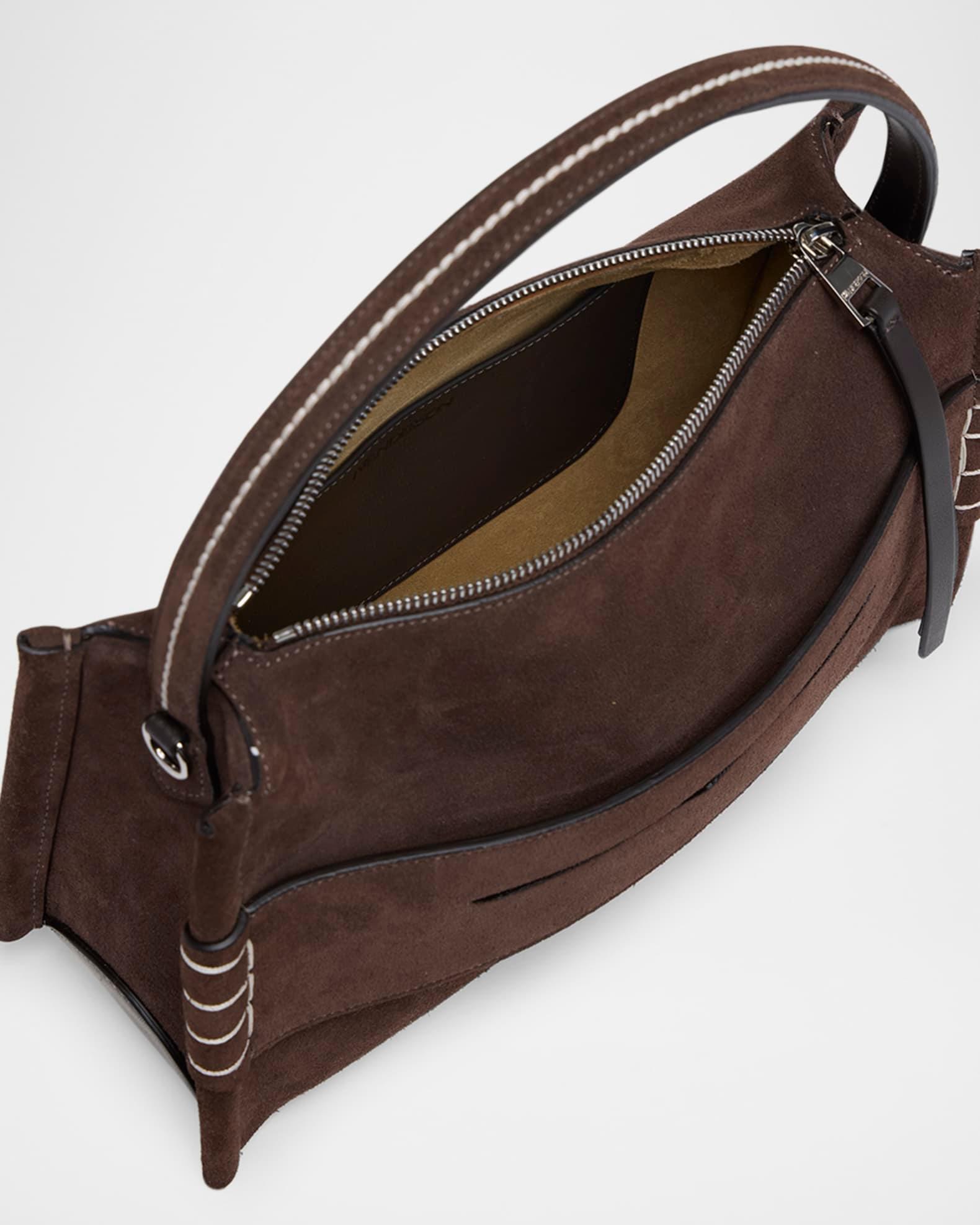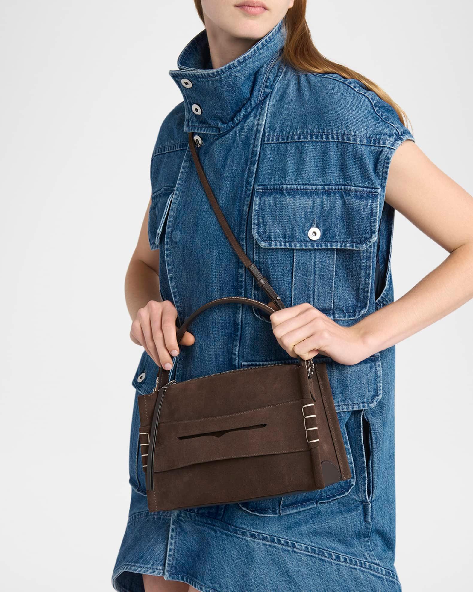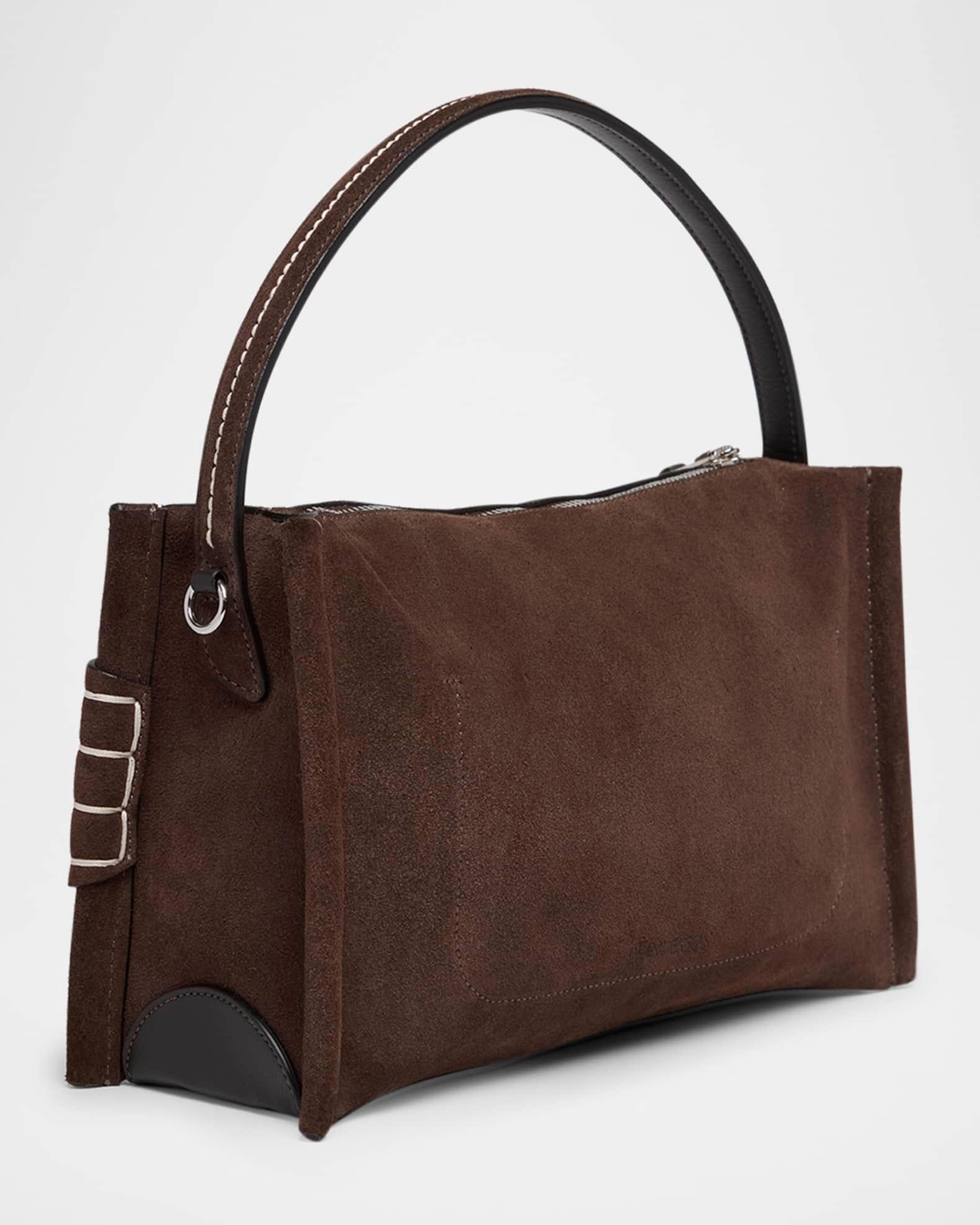 JW Anderson loafer structured crossbody bag in suede and leather Top handle Detachable, adjustable crossbody strap Can be worn as a top handle or crossbody bag Zip top closure Exterior, penny loafer strap Interior, one slip pocket Lining: Leather Approx. 8.1"H x 11.2"W x 3.9"D Made in Italy