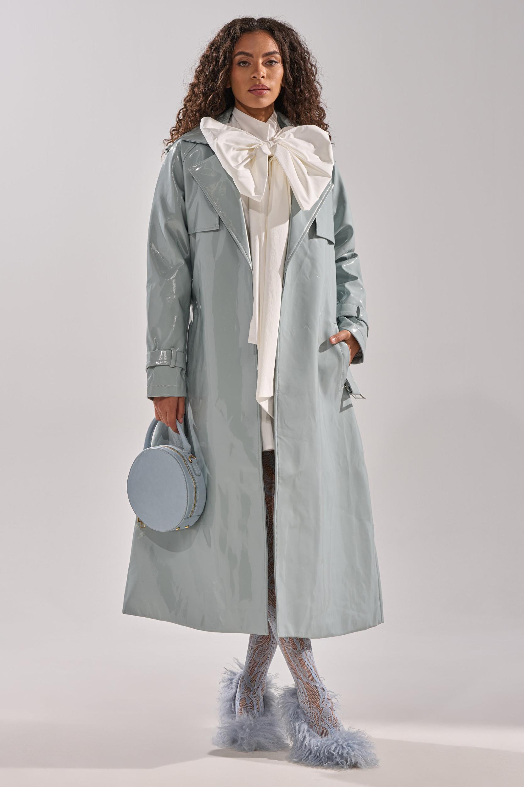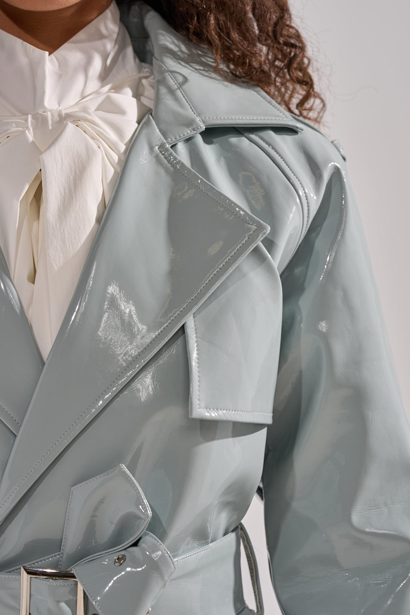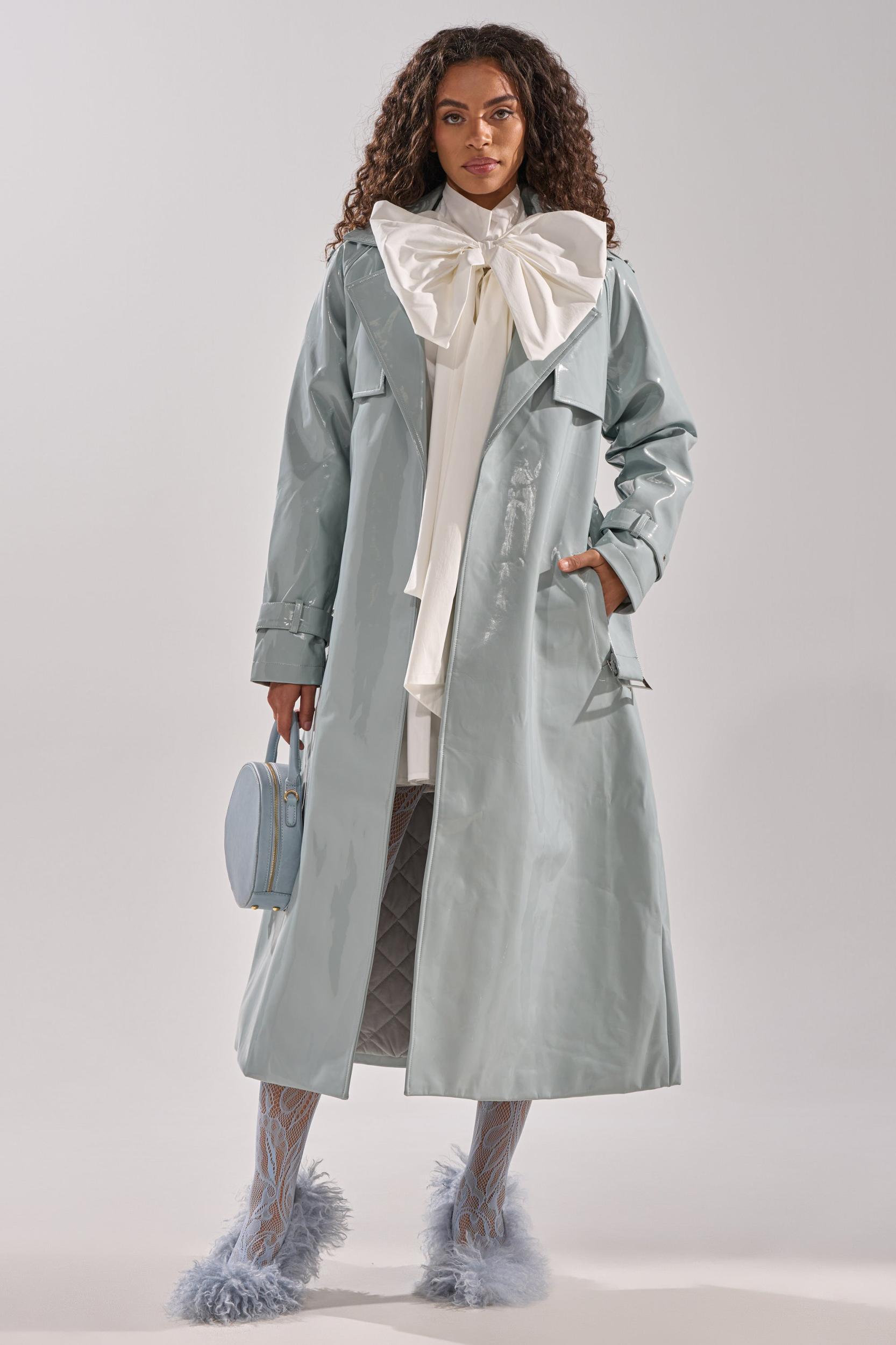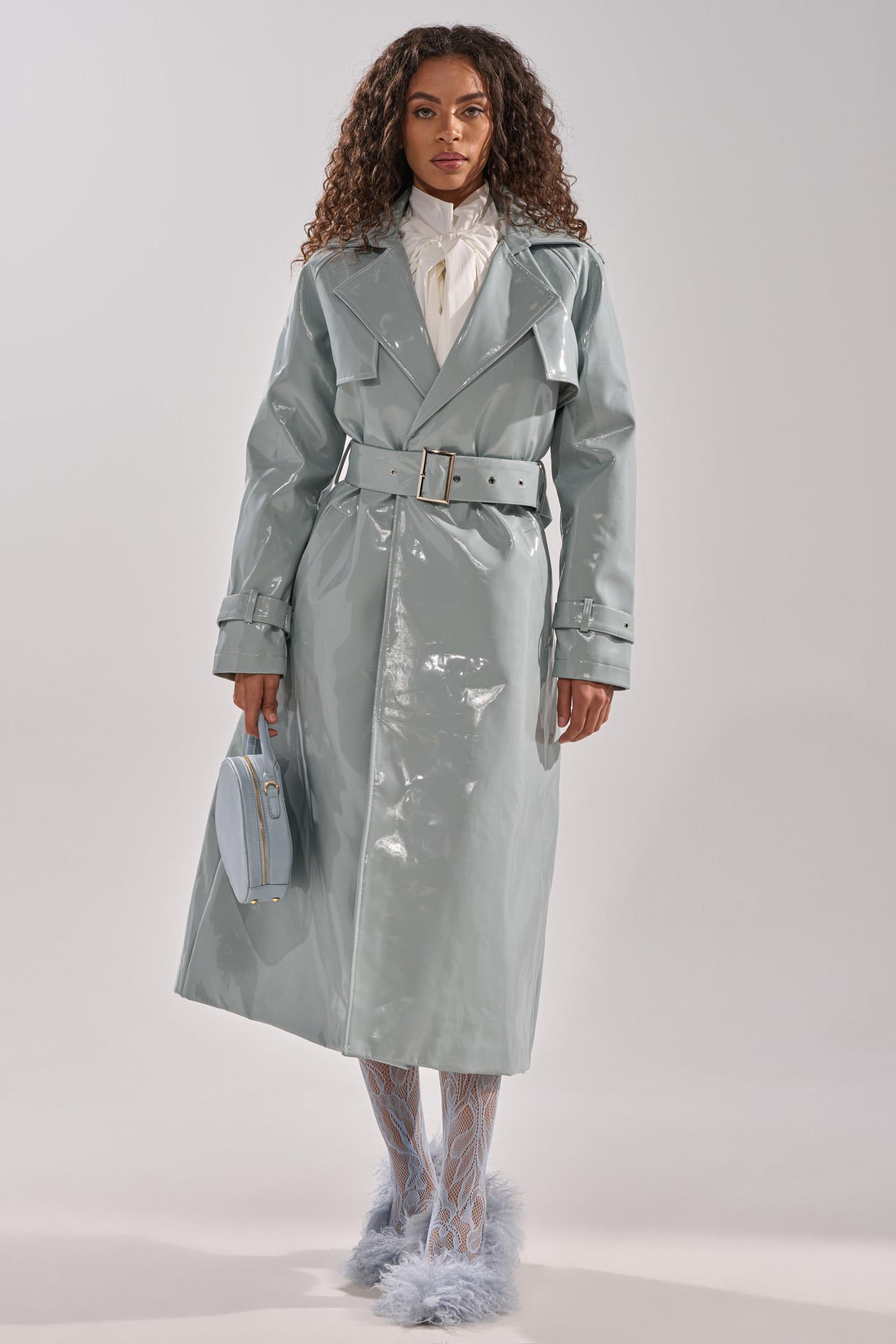 The AKIRA Label Locked and Loaded Patent Trench brings a modern flair to a timeless silhouette. Crafted from high-shine vegan patent leather, this trench features a quilted interior lining for warmth and structure. The belted waist cinches the shape, while side-slant pockets add functionality without compromising the sleek finish. Designed with wide lapels and buttoned cuffs, this statement coat elevates any outfit with a glossy, high-fashion polish. - 50% PU, 50% Polyester- Hand Wash or Dry Clean- No Stretch- Imported (all measurements approximate from size small)- 50” Shoulder to Hem- 17” Shoulder to Shoulder- 24” Sleeves- Model is 5’9” and wearing a size smallProduct ID: 1062997 (all measurements approximate from size 1X)- 52” Shoulder to Hem- 19” Shoulder to Shoulder- 26” SleevesProduct ID: 1063001