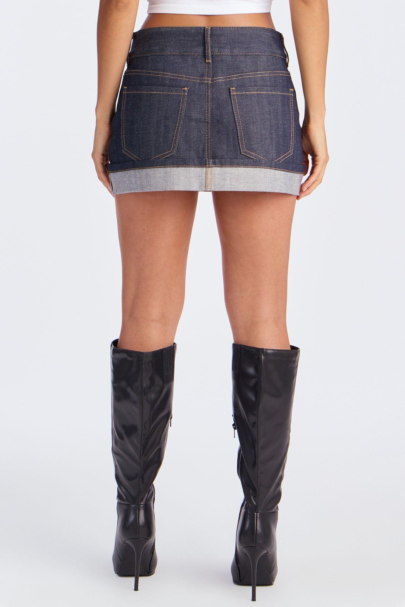 Available In Rinse Blue Wash. Mini Skirt Button and Zipper Closure Low Rise Cuffed Hem Denim Rigid Non Stretch 11" Length 99% Cotton 1% Spandex Imported California Proposition 65WARNING: Cancer and Reproductive Harm - www.P65Warnings.ca.gov.