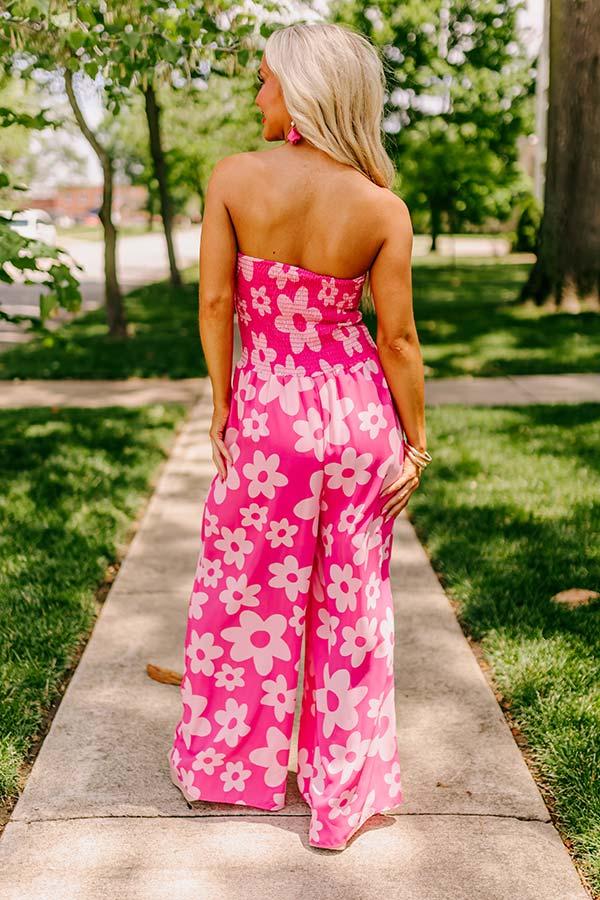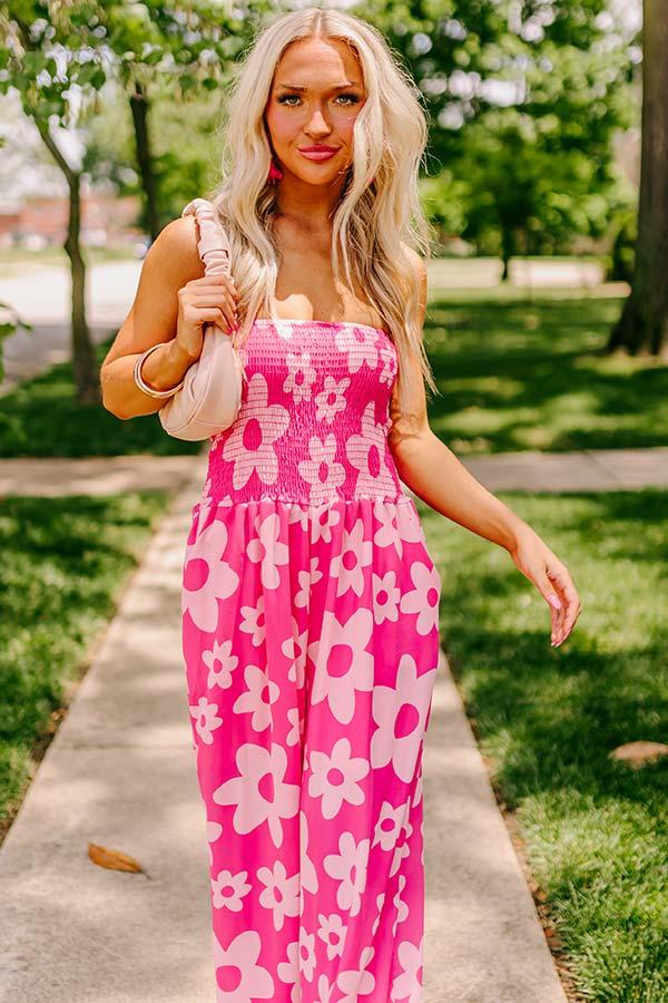 - Channel your inner flower child with this trendy jumpsuit! - Lightweight material with a flower print and a built-in shorts cut lining - A strapless neckline - A smocked bodice - Hidden side pockets - A flowy yet flattering silhouette that ends in straight floor length hemlines