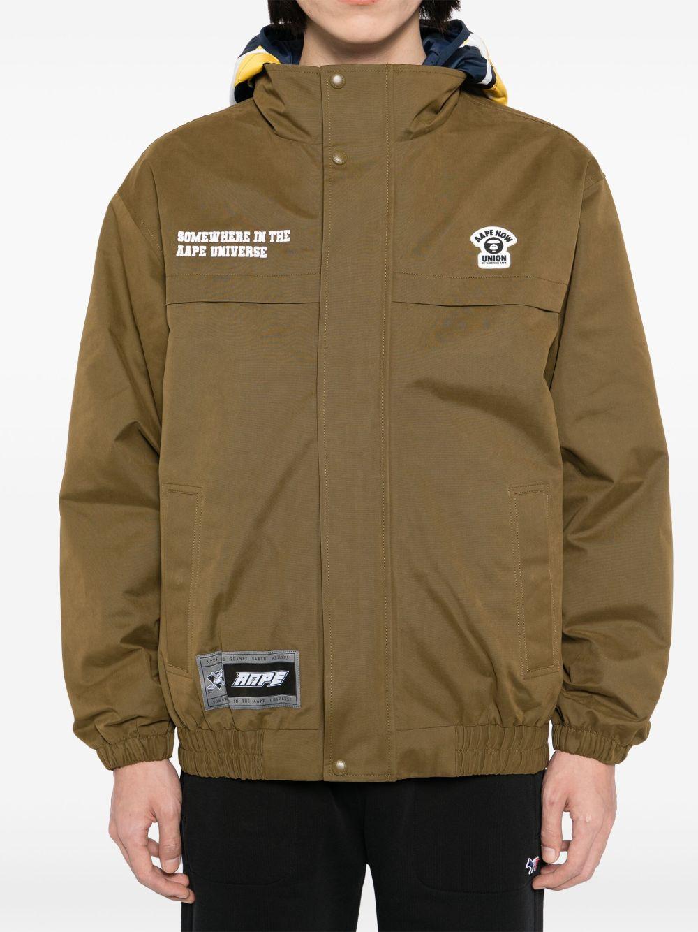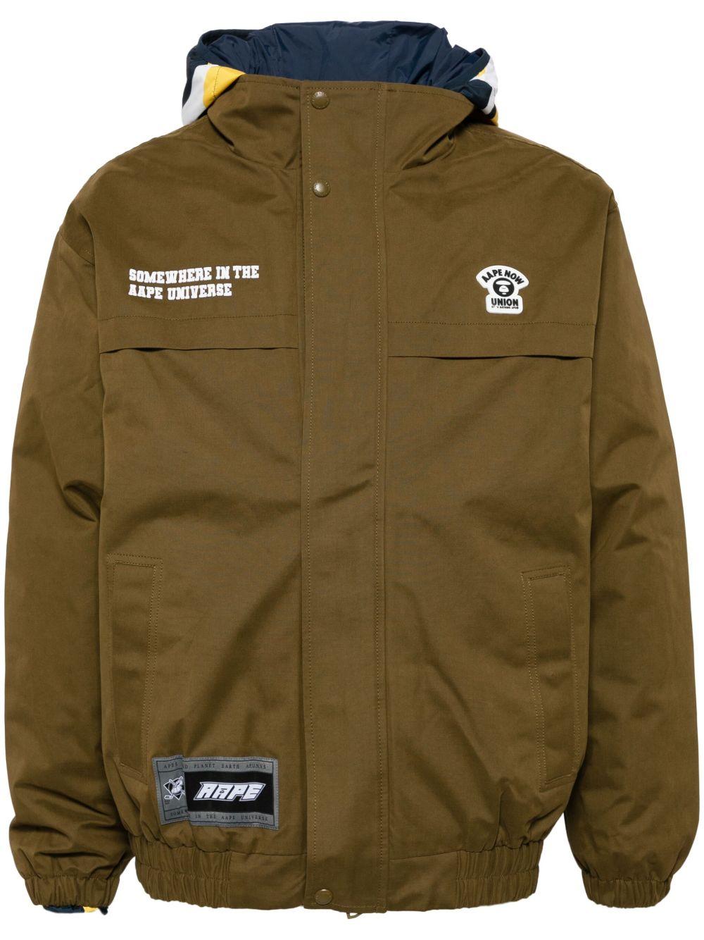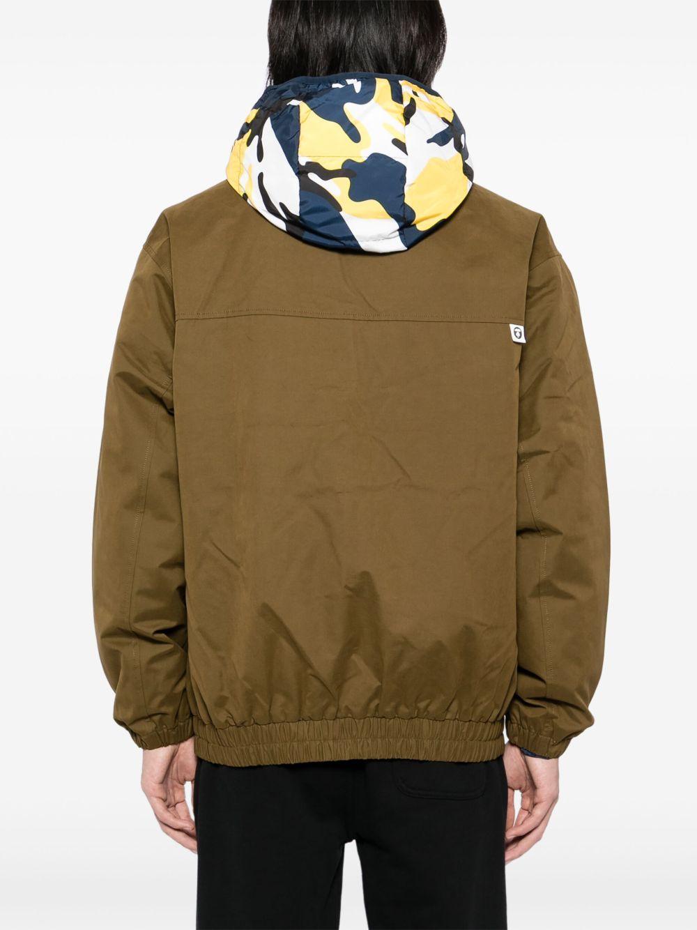 AAPE BY *A BATHING APE® logo-appliqué hooded jacket | Yellow | Side A: | dark yellow | front button and zip fastening | hook and loop fastening | mock neck | long sleeves | elasticated cuffs | logo patches to the front | appliqué logo | two side welt pockets | elasticated hem | Side B: | navy blue/multicolour | zip fastening | mock neck | classic hood | logo patches to the front | long sleeves | elasticated cuffs | camouflage print | elasticated hem | other fibers/Cotton | Hooded Jackets | Jackets | Clothing | Men