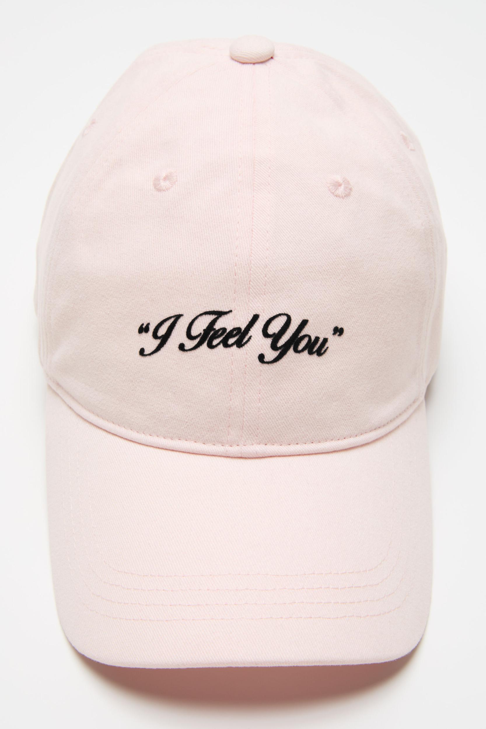 Six-panel baseball cap crafted from peached cotton twill with contrast topstitching. Features an embroidered "I Feel You" on the front panel and an adjustable D-ring closure for a custom fit. FN-UX-HATS000406
