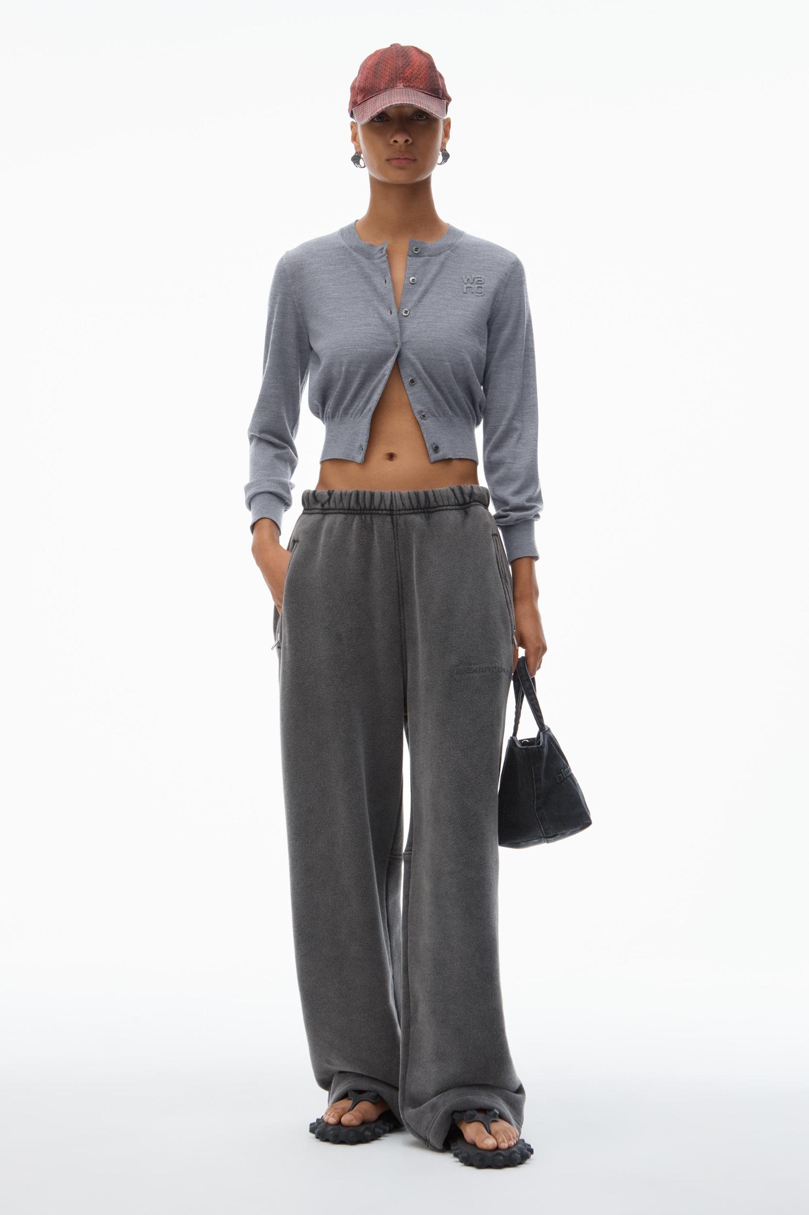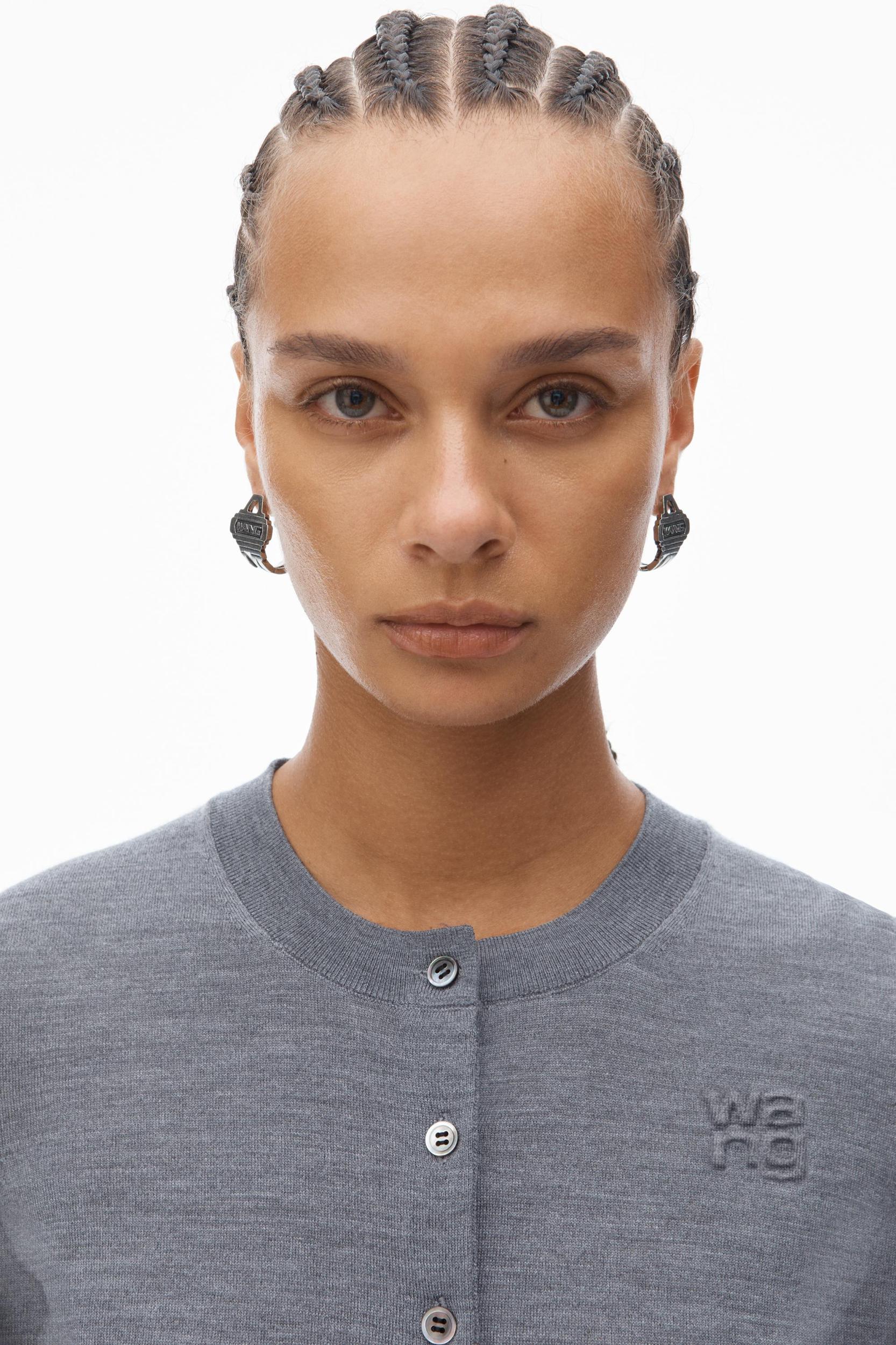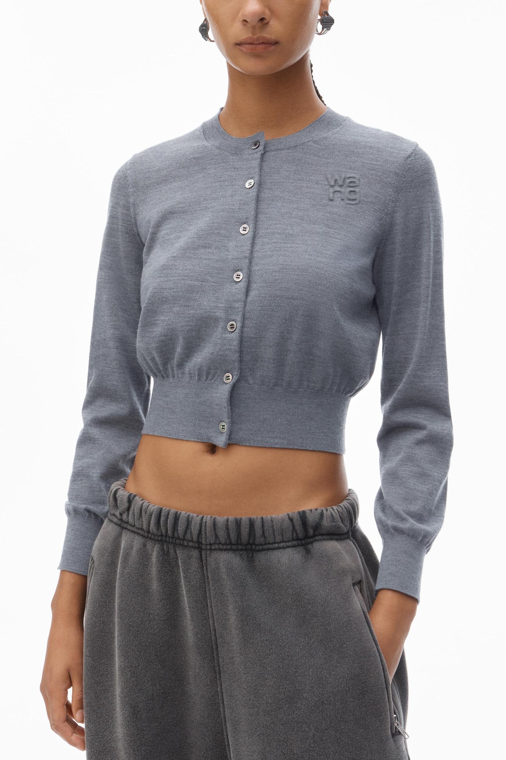 A stacked logo at the chest accents this long-sleeve lightweight cardigan in heather grey.