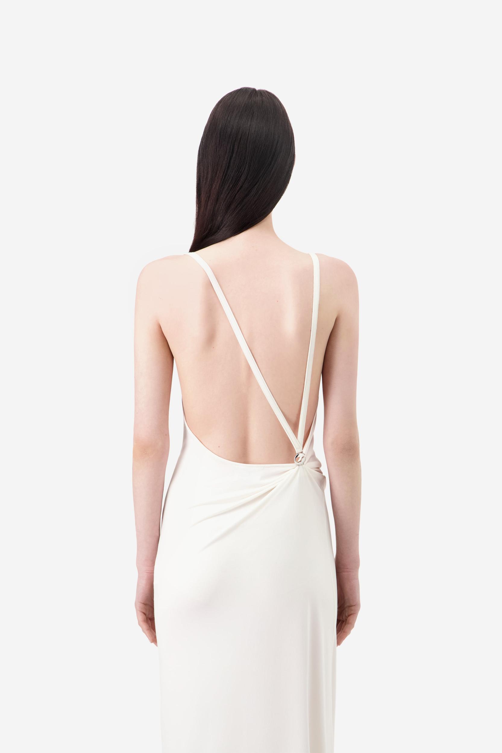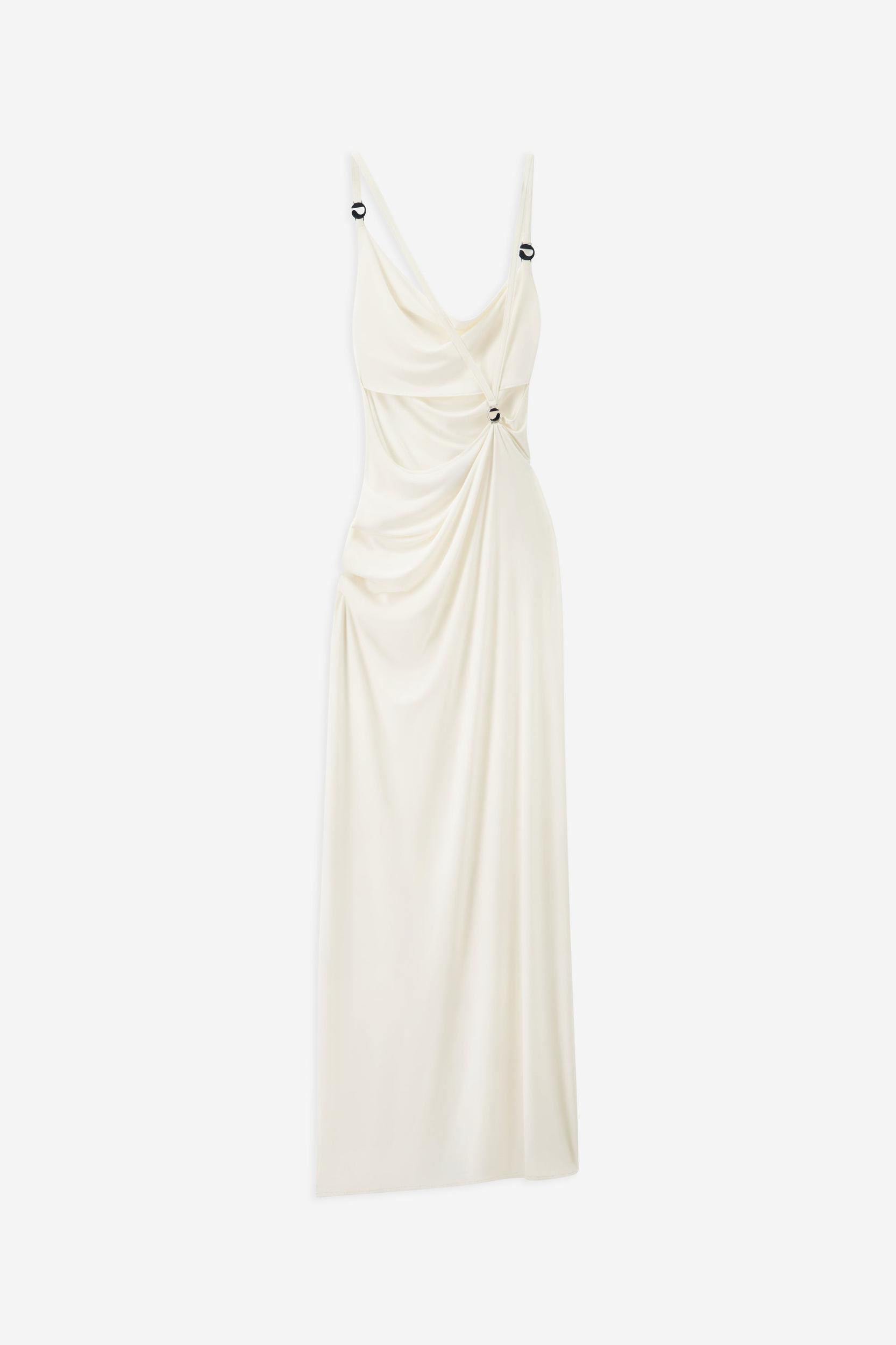 Crafted from fluid jersey, this floor-length dress clings and flows with effortless elegance. A softly draped cowl neckline meets two sculptural straps - one slim, one bold - connected by metallic logo clasps. The open back reveals an unexpected twist. Minimal, sensual, and quietly dramatic, this silhouette evokes movement even in stillness.