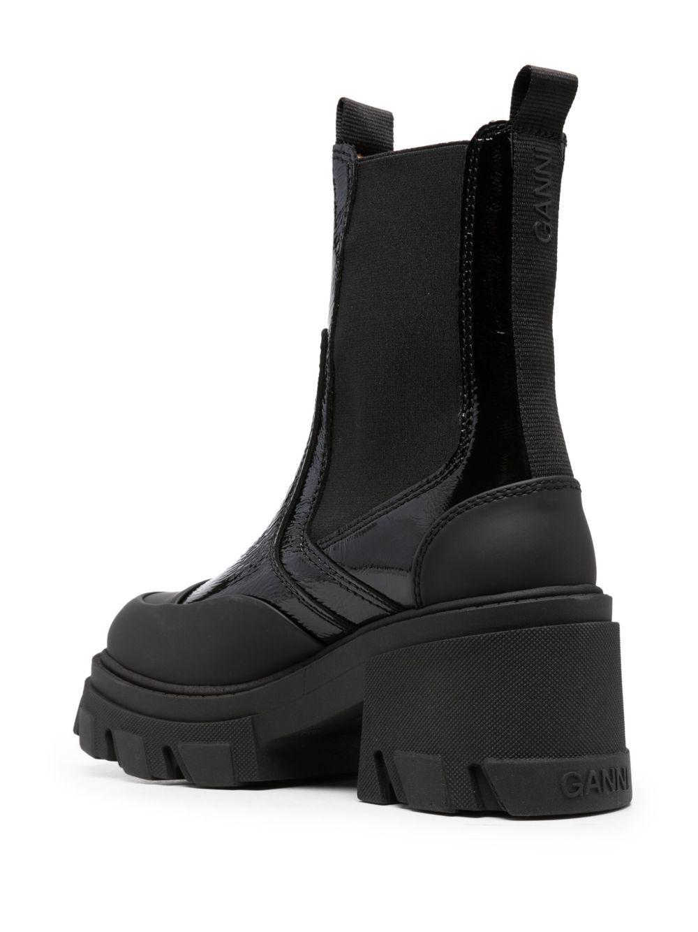GANNI logo-embossed panelled Chelsea boots | Black | black | panelled design | embossed logo to the rear | tonal stitching | pull-on style | round toe | ankle-length | elasticated side panels | double pull-tab at the opening | chunky rubber sole | block heel | Fabric/Rubber/Fabric/Rubber | Chelsea Boots | Boots | Shoes | Women