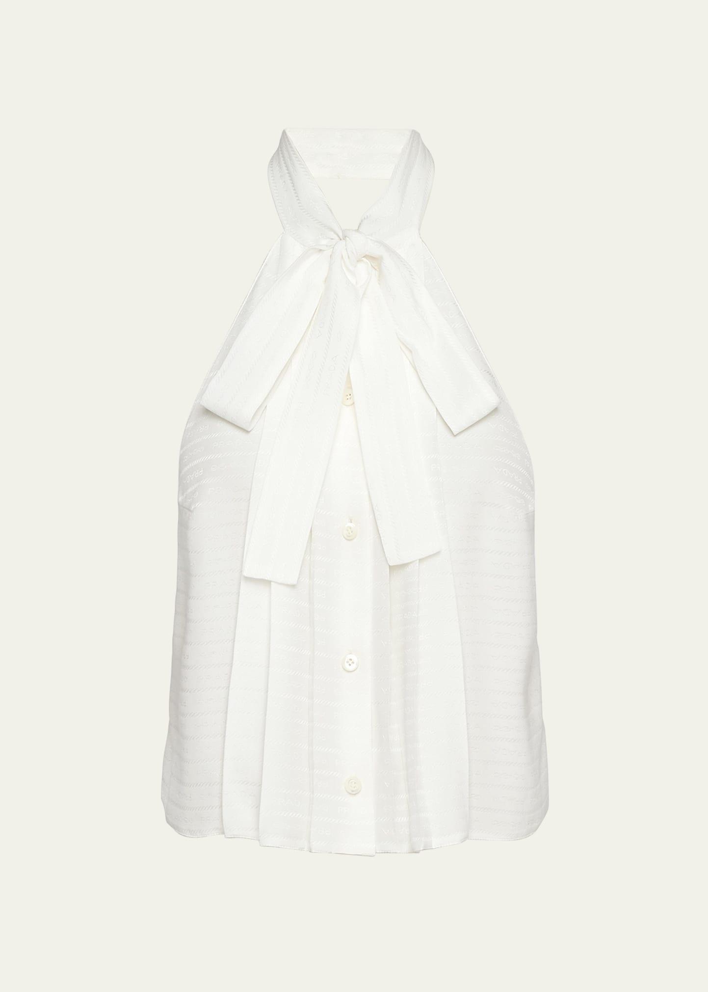 This top with feminine, vintage allure is given a romantic, modern twist through the all-over jacquard motif that decorates the garment with an iconic note. All-over jacquard lettering logo motif Decorative bow on the front Slim fit Halter neck Front button closure Sleeveless Flat pleats on the front Imported. Lsd Rtw - Prada Rtw > Prada > Saks Fifth Avenue > Barneys. Prada. Color: White. Size: 10.