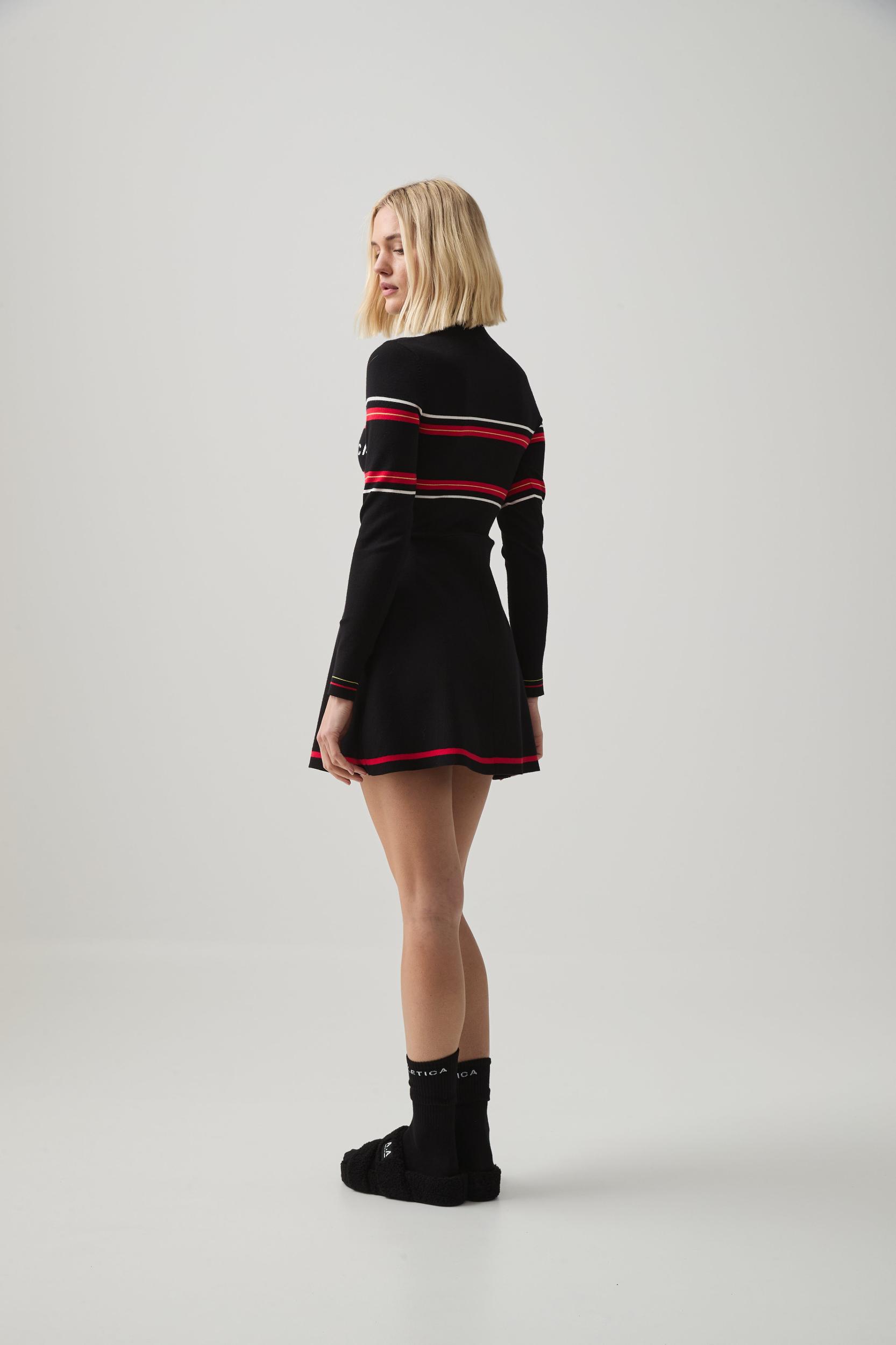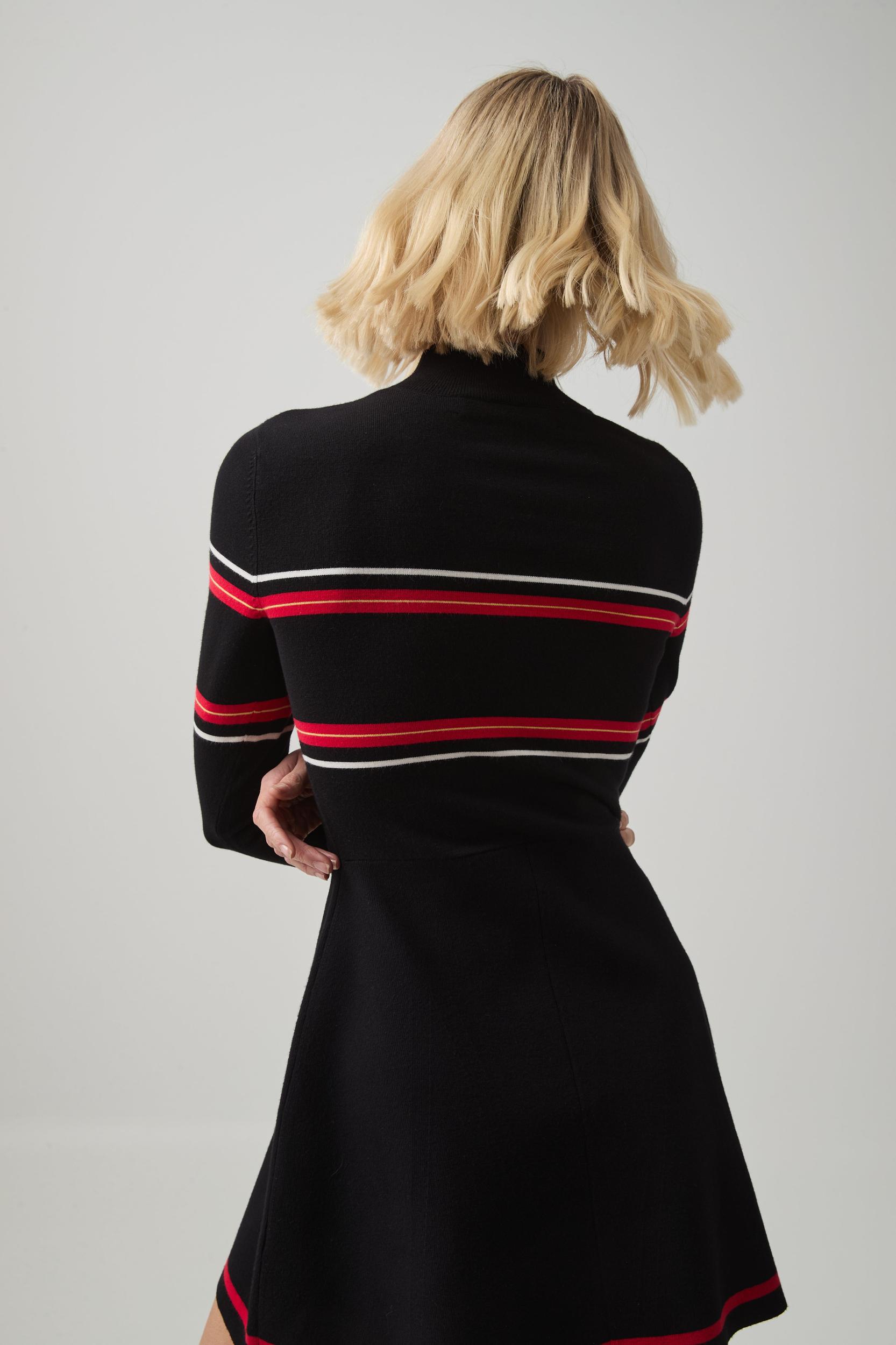 PRODUCT DETAILS Women’s long sleeve mini dress Fit-and-flare style High turtle neckline Jacquard front logo detail Contrast panels Ribbed finishes SIZE & FIT Laura wears a size 8/S and is 176cm/5’9” FABRICATION 57% Viscose 38% Polyester 5% Wool