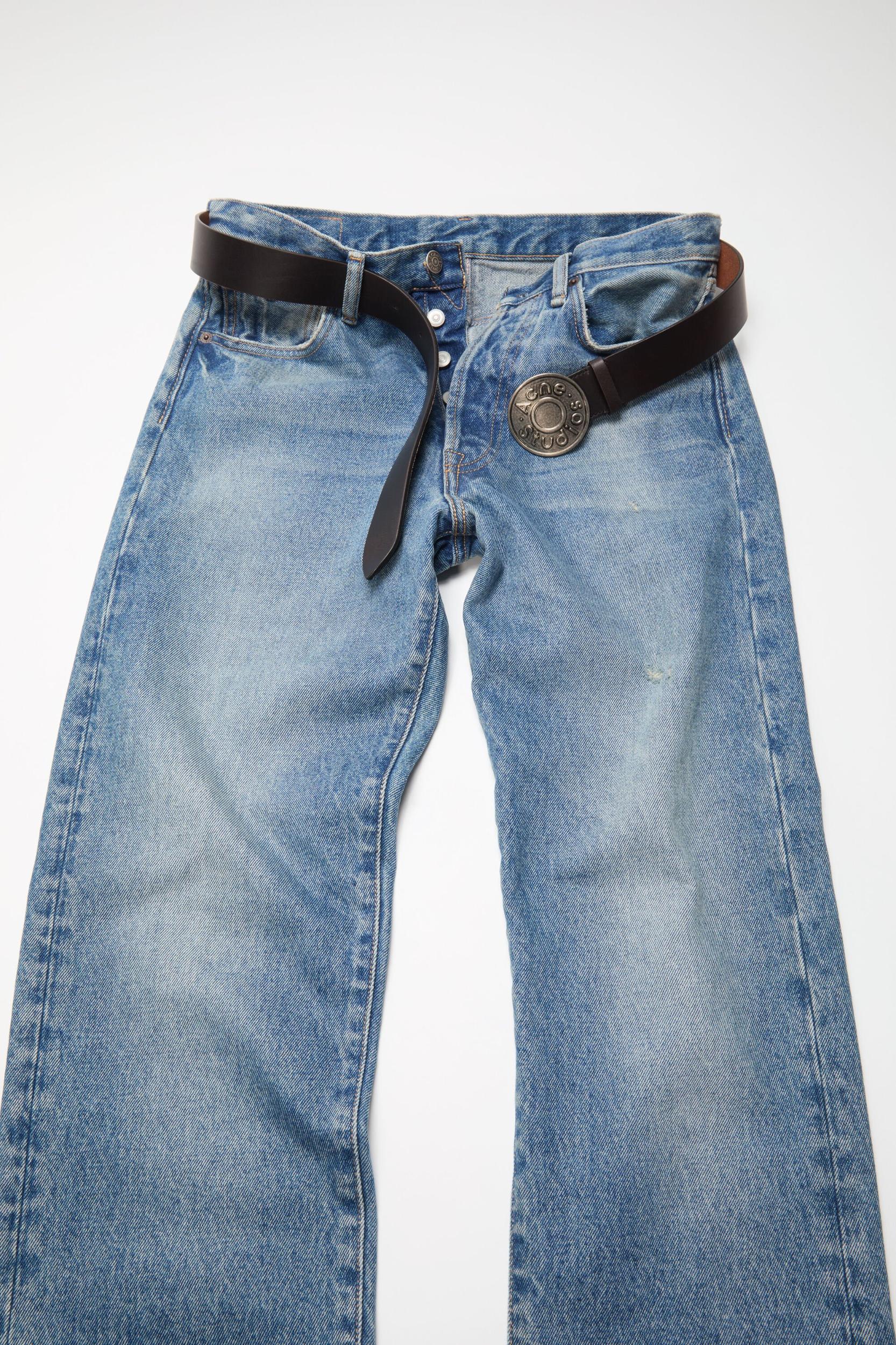 Buckle belt crafted from thick smooth leather with a black-finished surface. Designed as a unisex style, featuring a denim rivet-inspired antique silver buckle with Acne Studios logo. AC-UX-SLGS000020