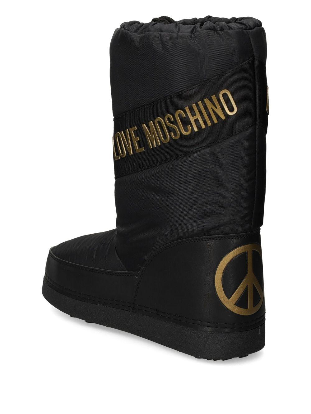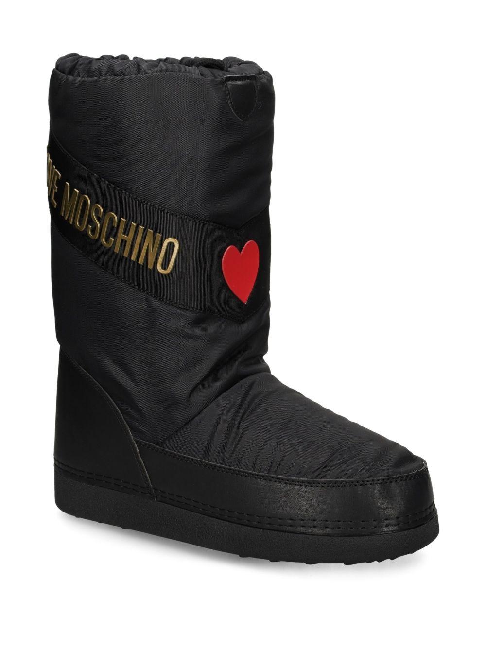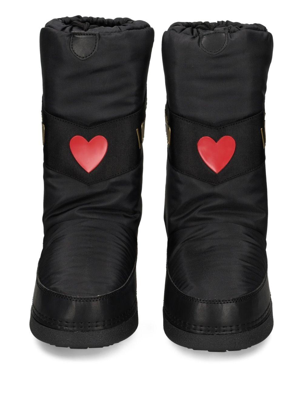 Love Moschino logo-print snow boots | Black | black | logo print | gold-tone logo | heart print | red heart | rubber sole | round toe | drawstrings fastening | Rubber/Fabric/Other Materials/Polyurethane | Rain & Snow Boots | Boots | Shoes | Women