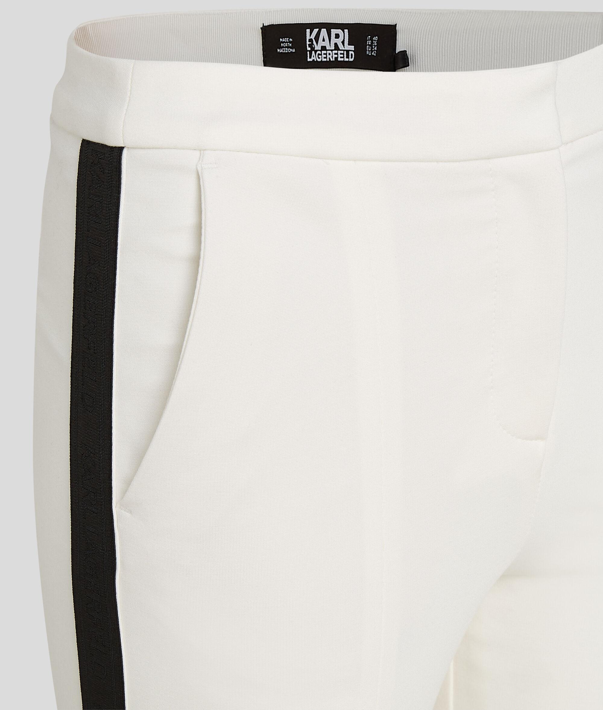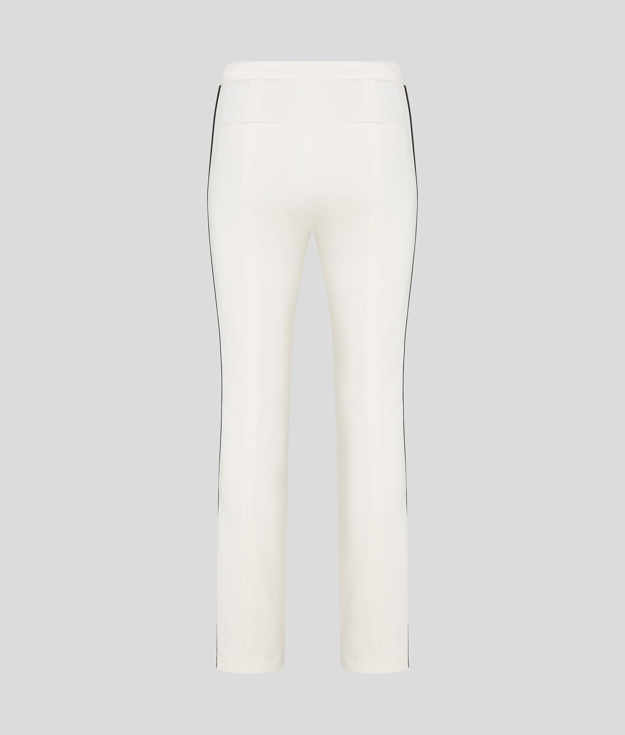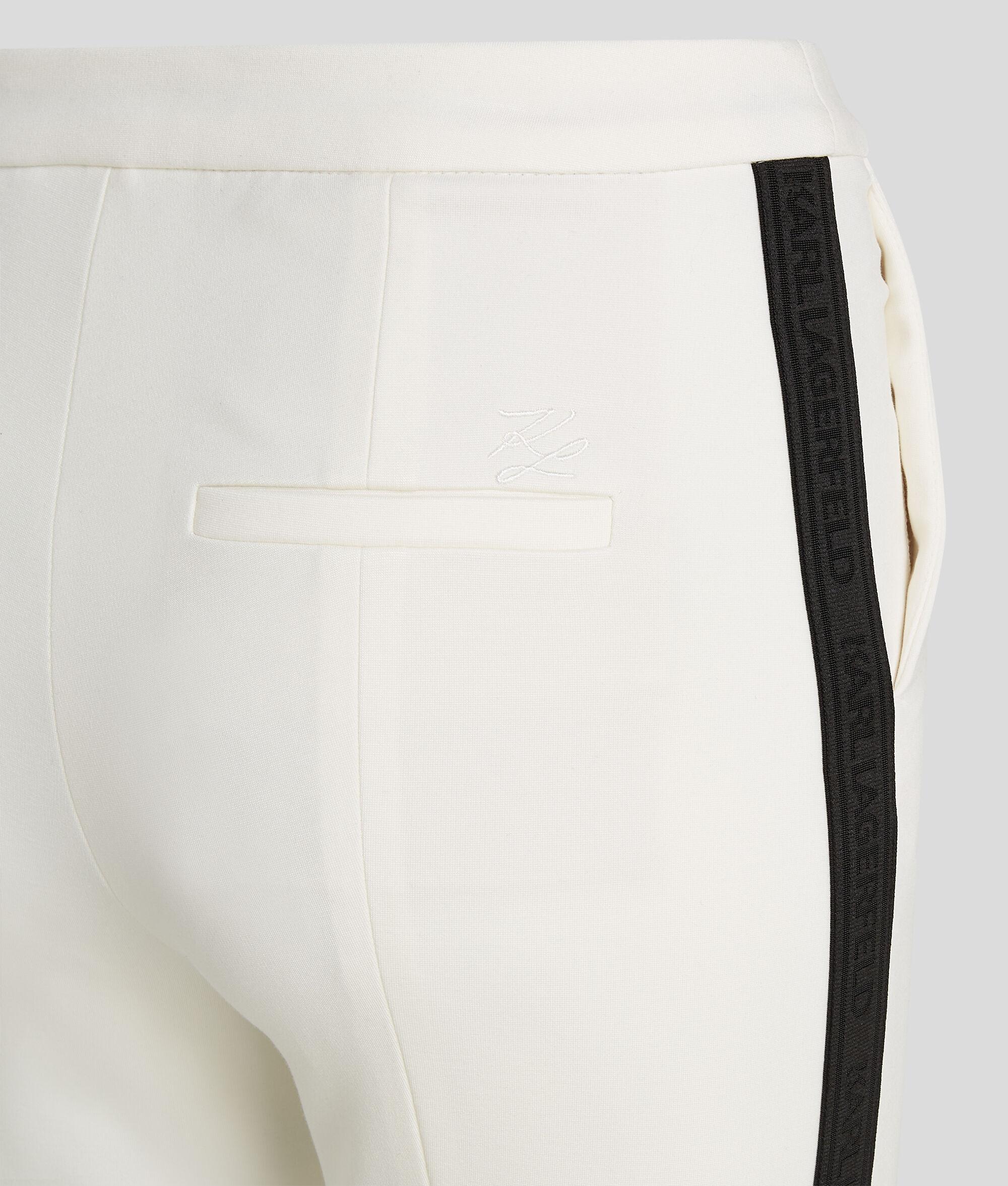 These sleek trousers, adorned with contrasting KARL logo tape running along the outer leg, offer a sharp and playful approach to tailoring. Cut from a comfortable stretch punto fabric, the sophisticated style pairs perfectly with the matching jacket for an undeniably chic monochrome look.