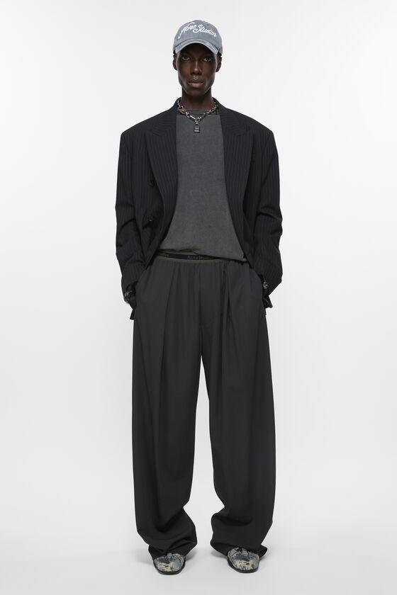 Double-breasted suit jacket crafted in wool blend yarn dyed barré pinstripe design woven in a fine herringbone structure. Constructed with peaked lapel and centre front 6 button detailing. Cut to a relaxed fit with constructed padded shoulders and hip length. FN-MN-SUIT000396