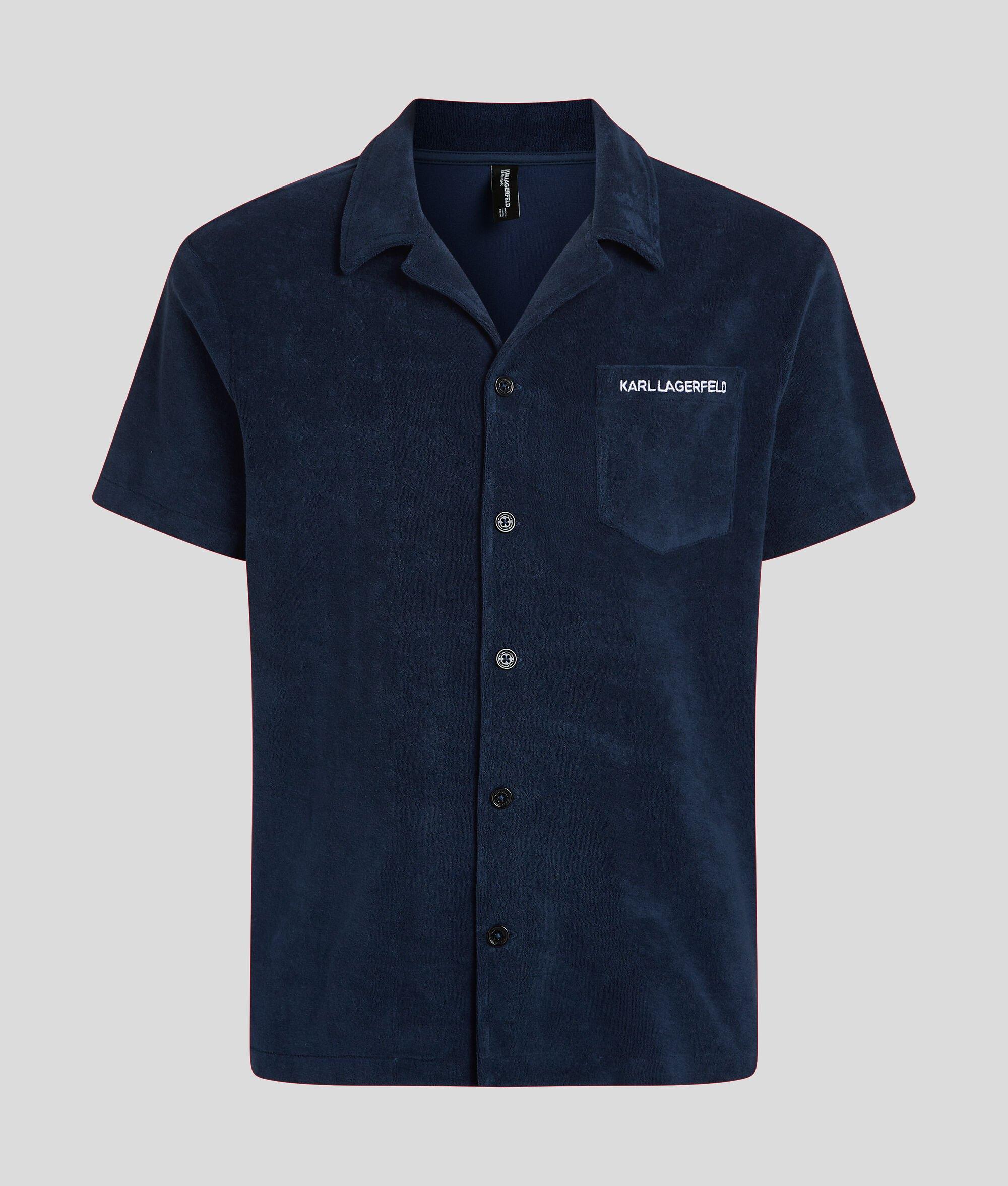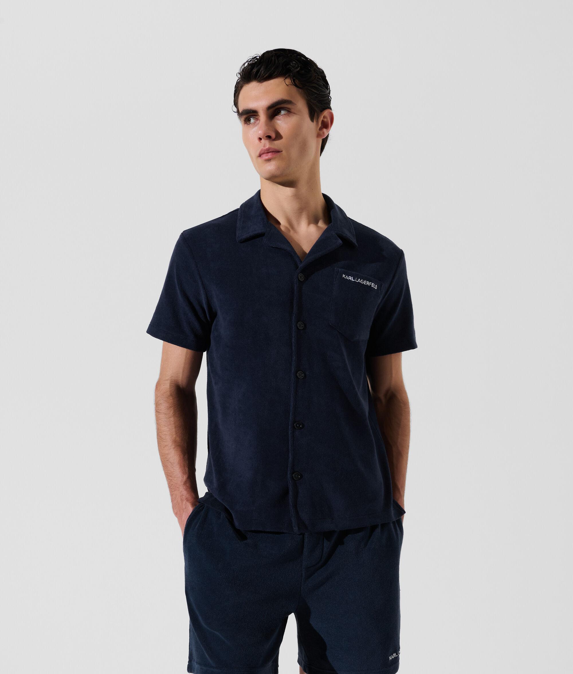 Elevate your beachwear collection with this towel shirt, featuring a button-front closure and short sleeves for effortless comfort. A chic left chest pocket showcases the KARL LAGERFELD logo, perfect for pairing with the matching shorts for a coordinated look.