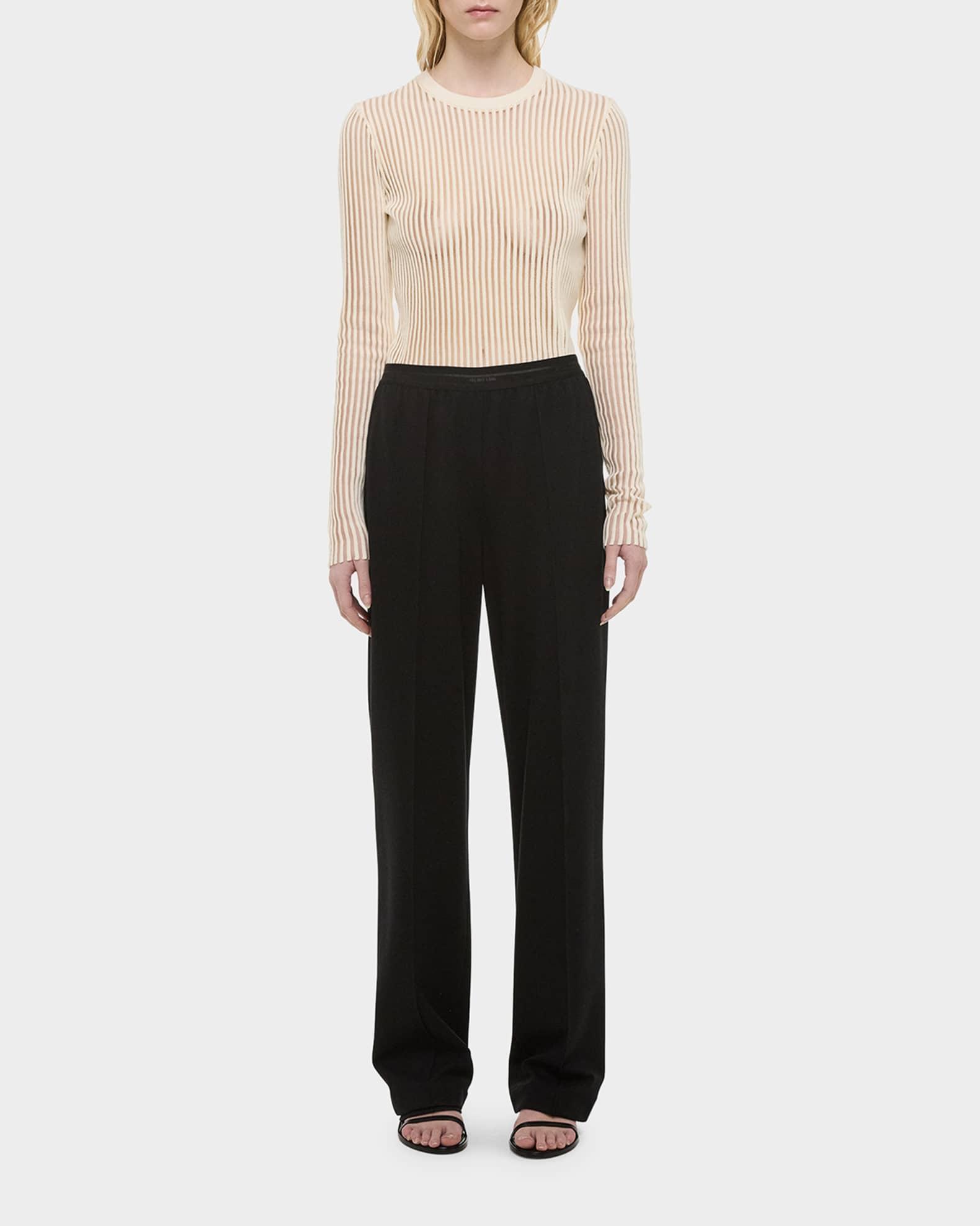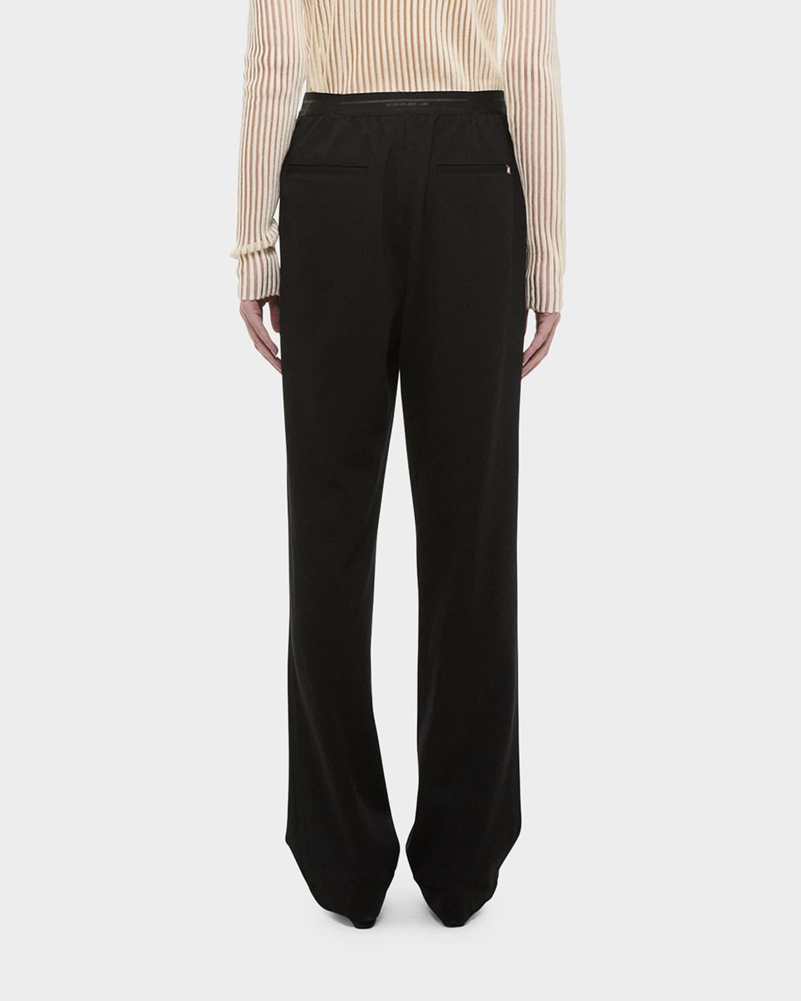Helmut Lang car trousers featuring a logo waistband Approx. 11.9" rise; 32.5" inseam Mid-rise; sits high on the hip Elastic waistband Side seam pockets; back welt pockets Pintuck front Straight legs Full-length Pull-on style Viscose/nylon/polyamide Unlined Dry clean Imported