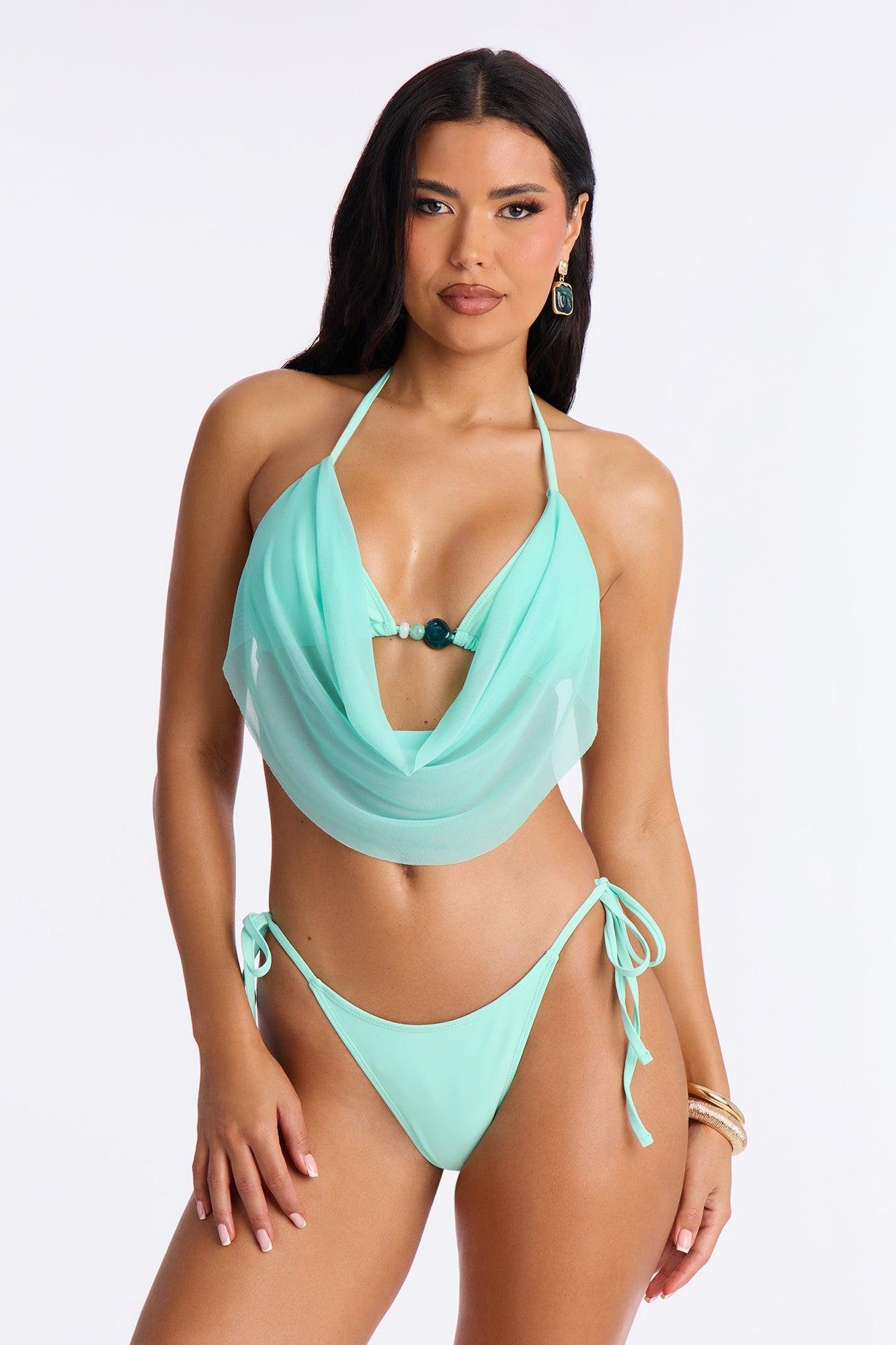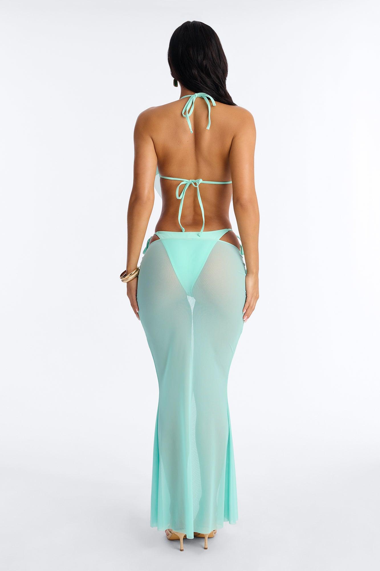 Available In Mint. 3 Piece Bikini Set Triangle Bikini Top Sheer Overlay Drop Beads Side Strap Bikini Bottom Swim Cover Up Skirt Crochet/Maxi Full Stretch Final Sale Self : 88% Nylon 12% Spandex Lining : 95% Polyester 5% Spandex Mesh : 95% Nylon 5% Spandex Cover up : 100% Polyester Imported Available In Plus Sizes California Proposition 65WARNING: Cancer and Reproductive Harm - www.P65Warnings.ca.gov.
