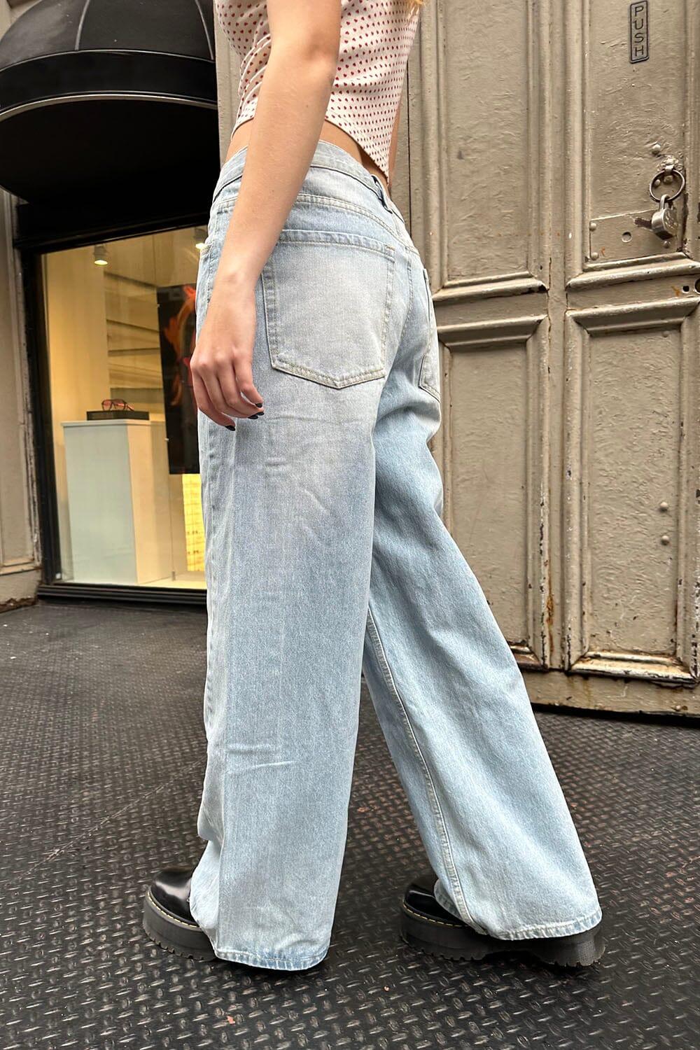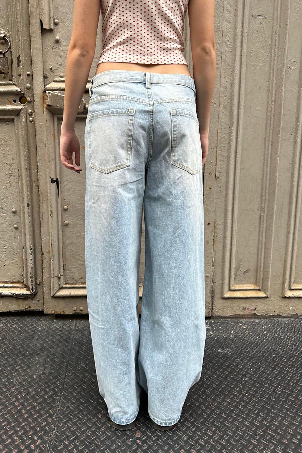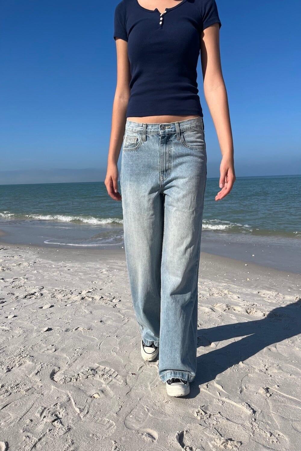 Baggy fit, wide straight leg denim jeans, with belt loops, zip and button closure, and adjustable elastic bands inside to change size of the waist. Fabrics: 100% cottonMeasurements: 10" (25cm) rise, 30" (76 cm) inseam, 30" (76 cm) largest to 22" (56 cm) smallest waistMade in: China