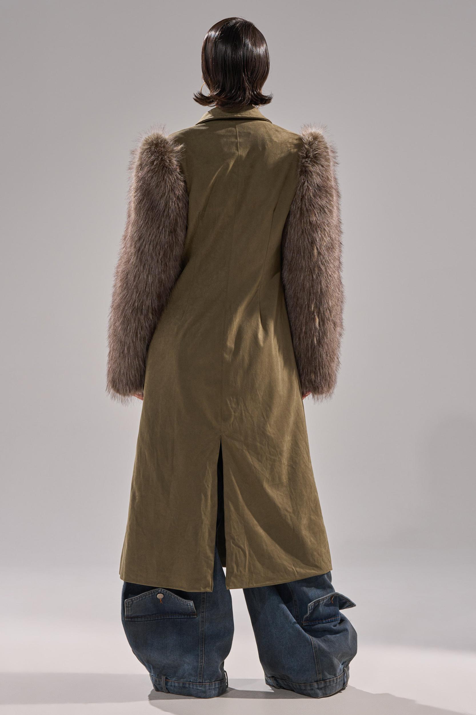 The AKIRA Label Lolita Fur Sleeve Trench is a sleek, elegant statement piece crafted from a soft olive faux suede. It features a notched lapel collar with a plunging neckline, slightly padded shoulders, plush faux fur sleeves in a slate grey colorway, dual waist pockets, a front button closure, a back vent slit, and a sleek inner lining. Complete with a straight midi-length hem for a sleek finish. Perfect for styling from day to night or layering over your favorite mini dress or denim set. - Shell: 90% Polyester 10% Spandex, Lining: 95% Polyester 5% Spandex - Slight Stretch- Imported (all measurements approximate from size small)- 48” Shoulder to Hem- 15” Shoulder to Shoulder- 25” Sleeves- Model is 5’7” and is wearing size smallProduct ID: 1061203 (all measurements approximate from size 1X)- 54” Shoulder to Hem- 17” Shoulder to Shoulder- 27” SleevesProduct ID: 1061206