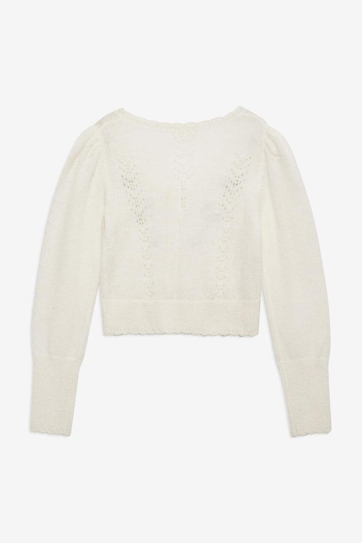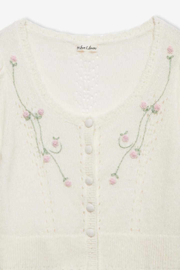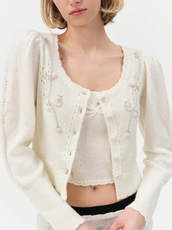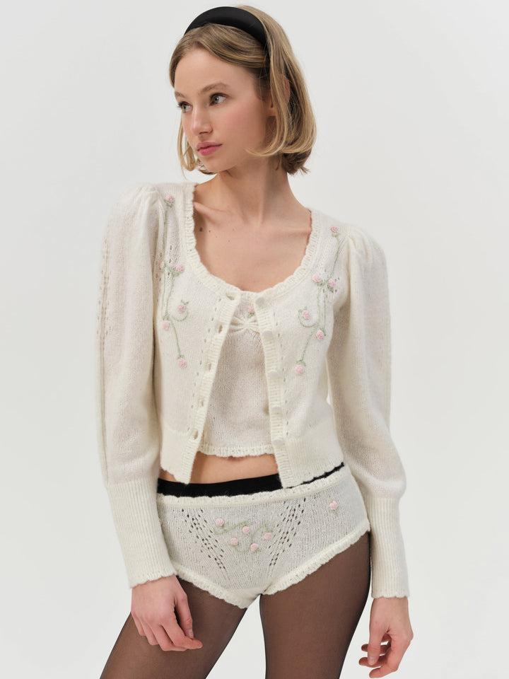 Meet the London knit cardigan—perfect for your lazy afternoon wardrobe. Crafted in a soft mohair pointelle, this cropped cardigan features a scalloped neckline and hem, and rosette embroidery. Pair it with the London Knit Cami Top and Panty for a co-ord look.