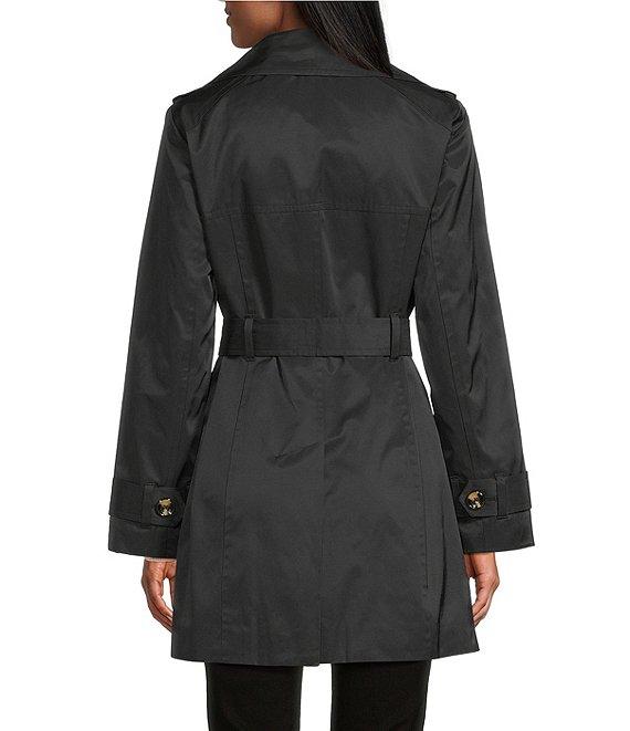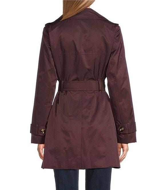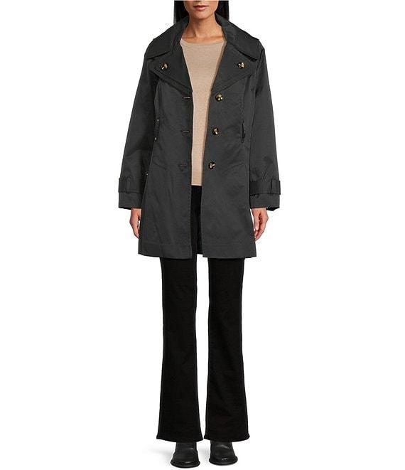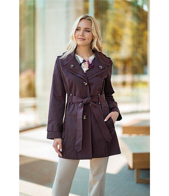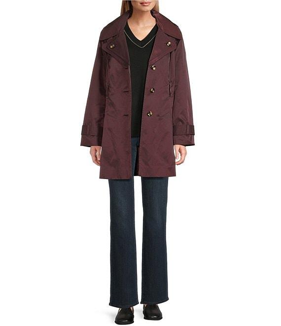 From London Fog, this coat features: Single breasted silhouette Double collar lapel neckline Removable hood Long sleeves with button cuffs Front flap button pockets Shoulder epaulets Self tie belt Mid weight Fitted fit Fully lined Straight hemline Button front closure Approx. 33" length Cotton/polyester; lining: polyester Machine wash Imported.