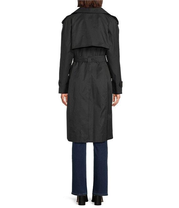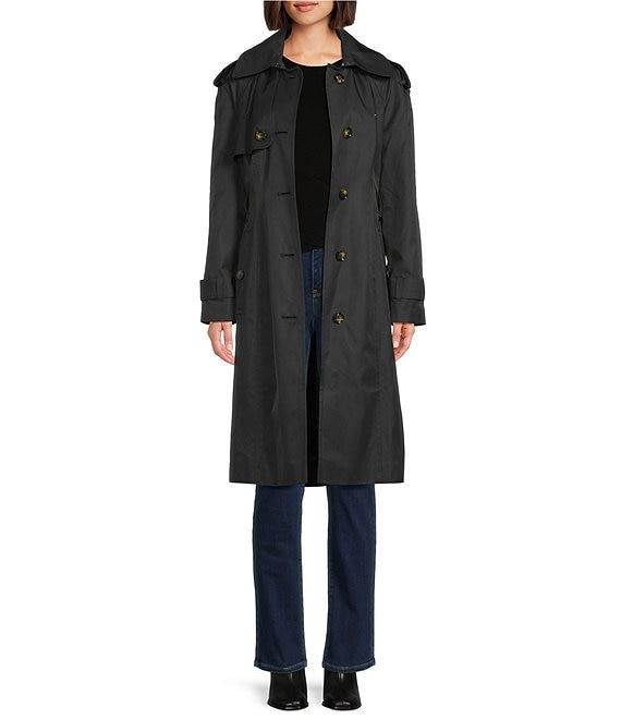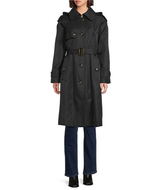 From London Fog, this coat features: Single breasted silhouette Point collar neckline Removable hooded Long sleeves with button cuffs Front button flap pockets Shoulder epaulet Self tie belt Gun flap Mid weight Fitted fit Fully lined Straight hemline Button front closure Approx. 42" length Cotton/polyester; lining: polyester Machine wash Imported.