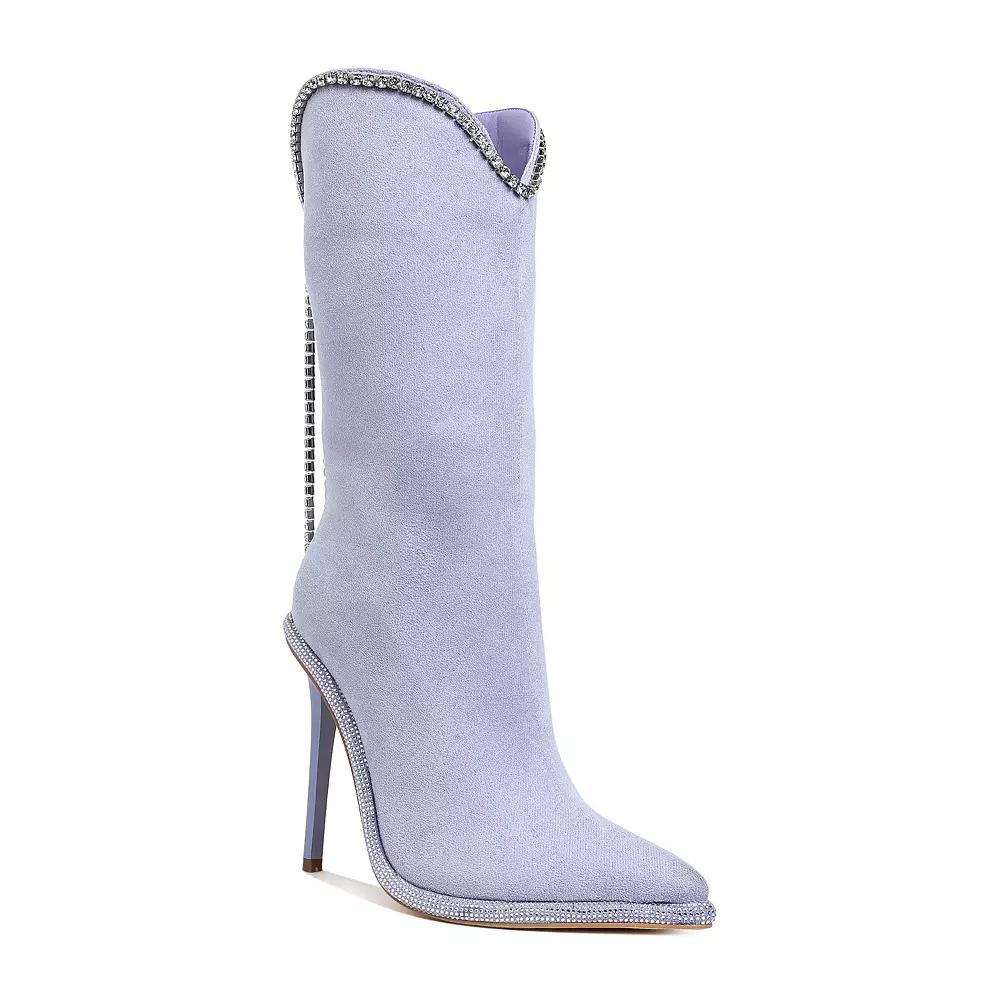 Experience a fusion of style and comfort with these chic calf boots adorned with a dazzling diamante chain detail from London Rag. Effortlessly elevate any outfit, whether paired with your favorite jeans or a stylish dress, all while enjoying all-day wearability. Click this FOOTWEAR GUIDE to find the perfect fit and more! - https://www.kohls.com/feature/shoesizeguide.jsp. FEATURES: Designed for all-day comfort, Soft materials for a cozy fit. DETAILS: Zipper closure, Slip-resistant outsole, Pointed toe, Platform height: 3/4-in., Heel height: 4-in., Imported. FIT & SIZE: Mid-calf boot shaft, Boot shaft height: 10 1/2-in., Boot shaft circumference: 9 1/2-in. MATERIAL & CARE: Faux leather and metallic faux leather upper, TPR outsole, Polyurethane midsole, lining and footbed, Spot clean. Size: 6.5. Color: Lilac. Gender: female. Age Group: adult. Material: SYNTHETIC.