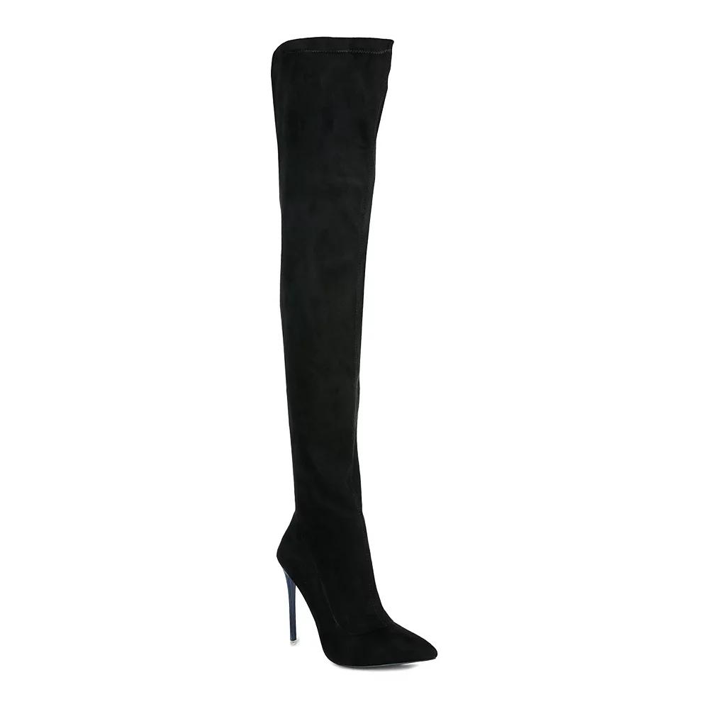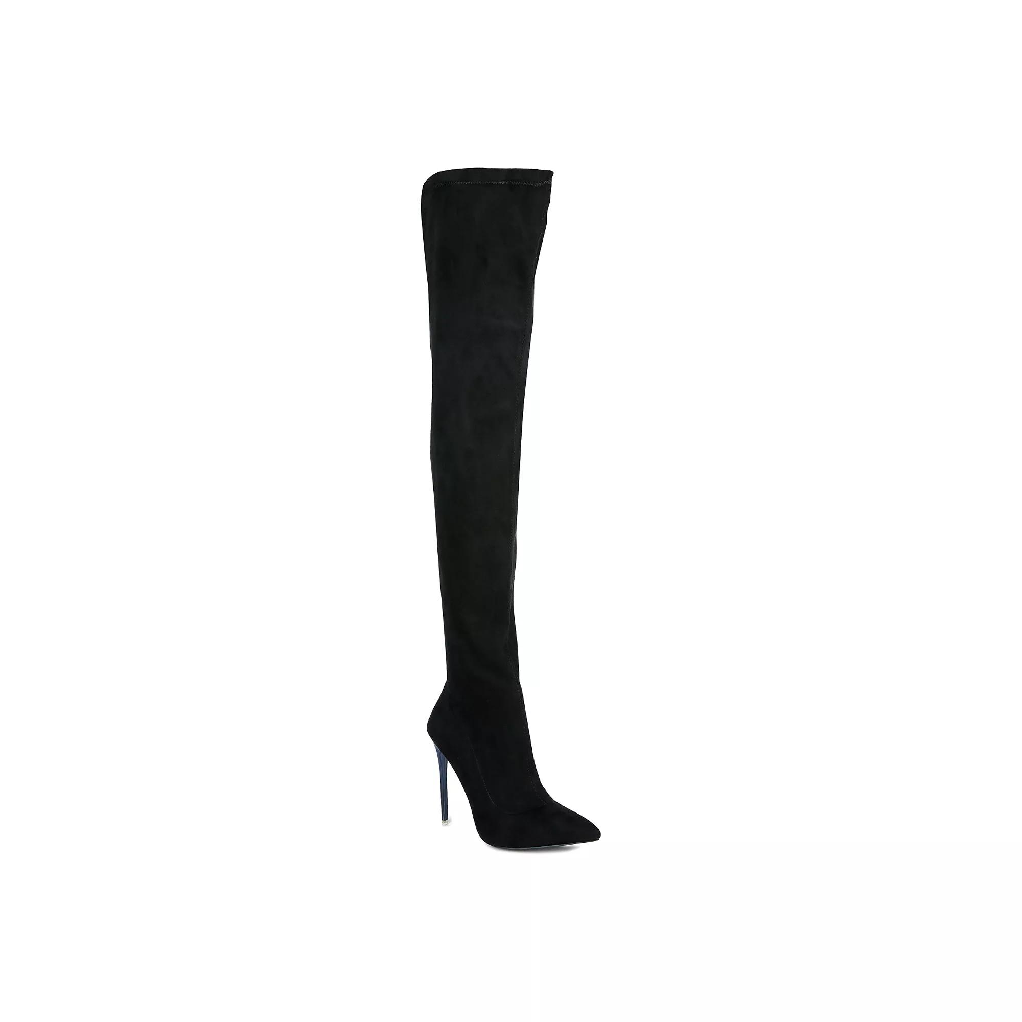 You will love these fashion-forward London Rag Atelier stretch stiletto boots. Click this FOOTWEAR GUIDE to find the perfect fit and more! You will love these fashion-forward London Rag Atelier stretch stiletto boots. Click this FOOTWEAR GUIDE to find the perfect fit and more! SHOE FEATURES Knee-high design Stretch construction Durable rubber outsole Zipper closure for a secure fitSHOE CONSTRUCTION Faux suede upper Polyester lining Polyurethane midsole TPR outsoleSHOE DETAILS Pointed toe Zipper closure Padded footbed 3.75-in. heel height 0.39-in. platform height 24.409-in. shaft 16.811-in. circumference Spot clean Imported Color: Black. Gender: female. Age Group: adult.