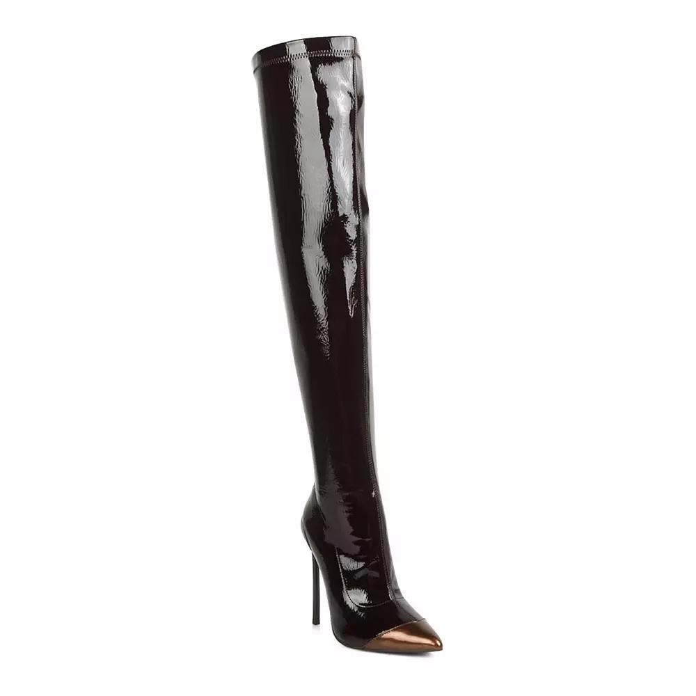 Youll turn heads in these London Rag Chimes womens thigh-high boots.Click this FOOTWEAR GUIDE to find the perfect fit and more! Youll turn heads in these London Rag Chimes womens thigh-high boots. Click this FOOTWEAR GUIDE to find the perfect fit and more! SHOE FEATURES Toe-cap detail Stiletto heelSHOE CONSTRUCTION Polyurethane upper and midsole Polyester lining TPR outsoleSHOE DETAILS Pointed toe Zipper closure Padded footbed 5.85-in. heel 0.39-in. platform 21.3-in. shaft 16.65-in. circumference Spot clean Imported London Rag Womens Shoe Size Chart Color: Dark Brown. Gender: female. Age Group: adult.