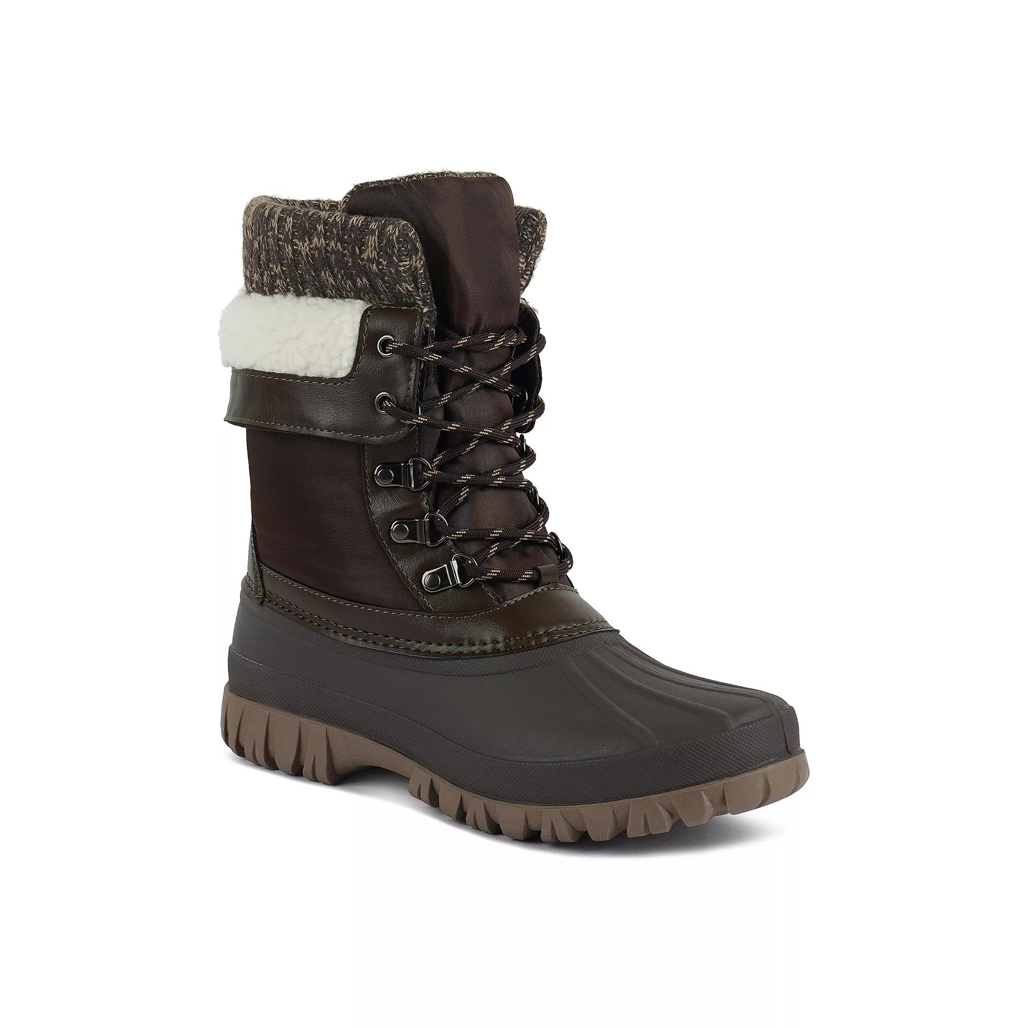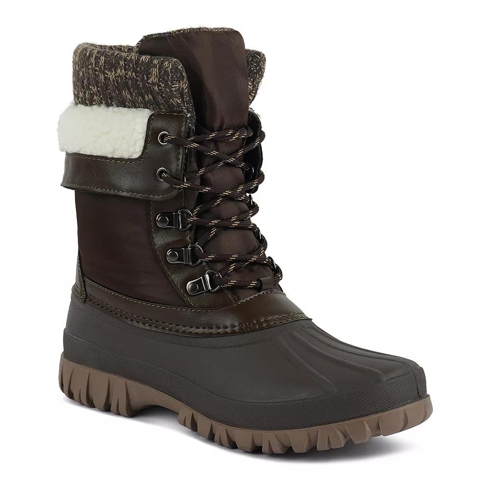 Give your footwear game a warm new upgrade with these London Rag Delphine Womens Knitted Collar Boots. Give your footwear game a warm new upgrade with these London Rag Delphine Womens Knitted Collar Boots. FEATURES Mid-calf height Knitted collarDETAILS Faux Leather Round toe Lace-up Closure Polyurethane footbed TPR lug outsole Heel height: 2.8 in. Platform height: 1.5 in. Boot shaft height: 6.85 in. Boot shaft circumference: 10.10 in. Spot clean Imported Color: Brown. Gender: female. Age Group: adult.