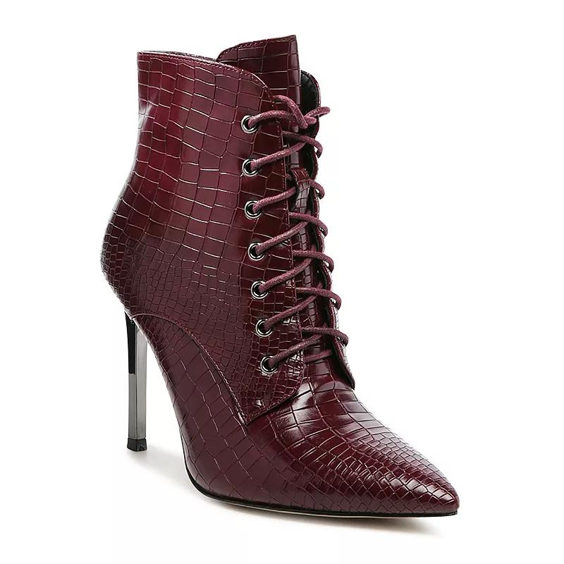 Step into chic style with the cool croc embossed style of these London Rag Escala womens heeled booties.Click this FOOTWEAR GUIDE to find the perfect fit and more! Step into chic style with the cool croc embossed style of these London Rag Escala womens heeled booties. Click this FOOTWEAR GUIDE to find the perfect fit and more! SHOE FEATURES Faux croc embossed upper Zipper for easy on and offSHOE CONSTRUCTION Polyurethane upper Manmade lining Rubber outsoleSHOE DETAILS Pointed toe Zipper closure Padded footbed 3-in. heel 3.5-in. shaft Size: 10. Color: Burgundy. Gender: female. Age Group: adult.