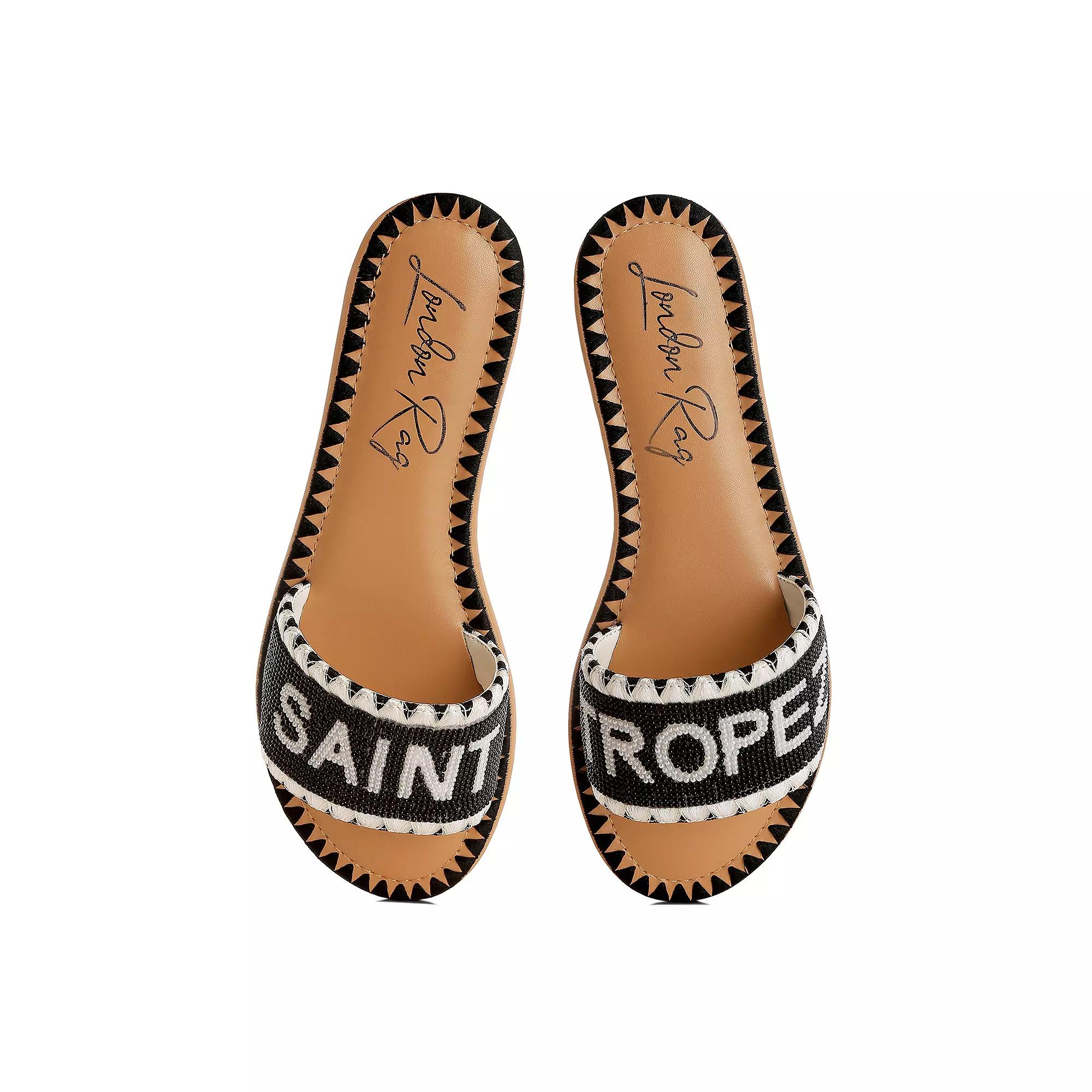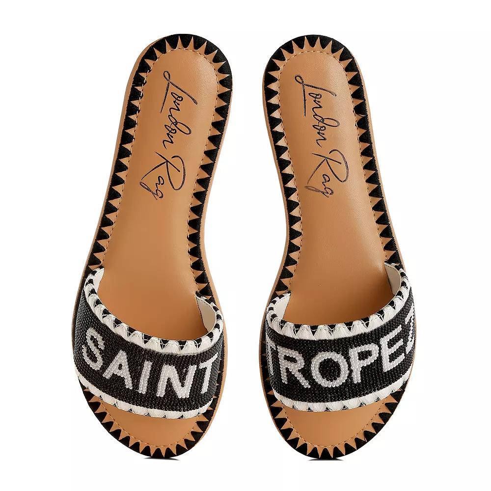 Step into effortless style and comfort with London Rag sandals that are perfect for your weekend adventures. With a delightful beaded design, these slip-on flats ensure your feet stay pampered while you stroll along sunny beach boards or catch up with friends over brunch. Click this FOOTWEAR GUIDE to find the perfect fit and more! - https://www.kohls.com/feature/shoesizeguide.jsp. FEATURES: Comfortable fit. MATERIAL & CARE: Microfiber with beads, Polyurethane midsole, lining & footbed, Rubber outsole, Spot clean. DETAILS: Round toe, Slip-on closure, Slip-resistant outsole, Heel height: 0.8-in., Imported. Size: 7. Color: Black. Gender: female. Age Group: adult. Material: SYNTHETIC.