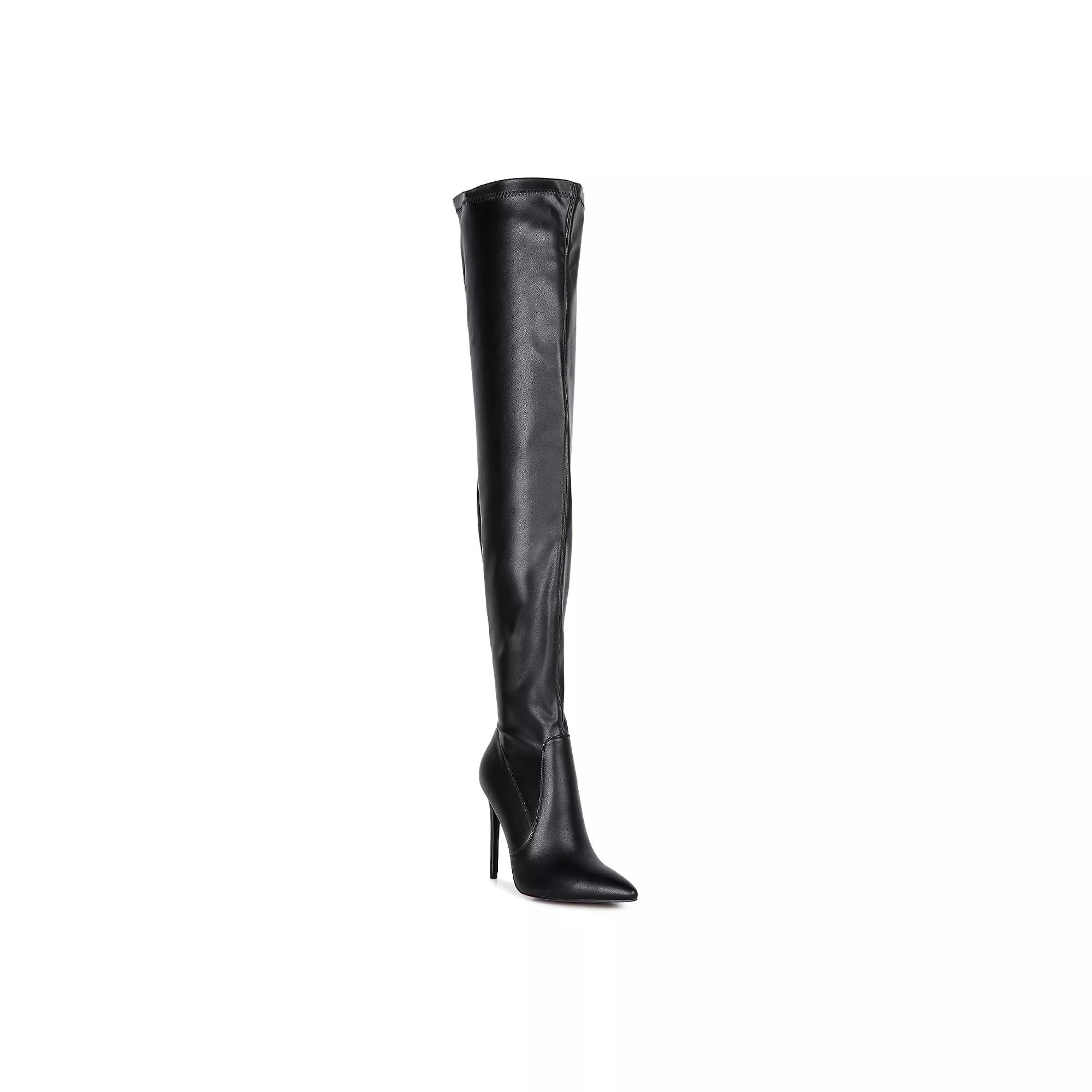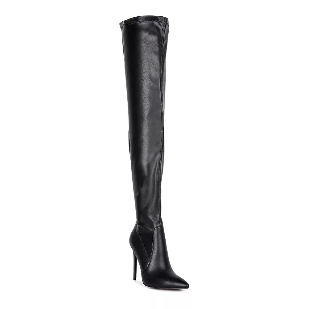 Sleek and bold style is easy with these London Rag Gush over-the-knee high heel boots. Click this FOOTWEAR GUIDE to find the perfect fit and more! - https://www.kohls.com/feature/shoesizeguide.jsp. SHOE FEATURES: Over-the-knee design, Durable rubber outsole, Zipper closure for a secure fit. SHOE CONSTRUCTION: Polyurethane upper and midsole, Polyester lining, TPR outsole. SHOE DETAILS: Pointed toe, Zipper closure, Padded footbed, 3.5-in. heel height, 0.39-in. platform height, 24.409-in. shaft, 17.126-in. circumference, Spot clean, Imported. Color: Black. Gender: female. Age Group: adult. Material: SYNTHETIC.