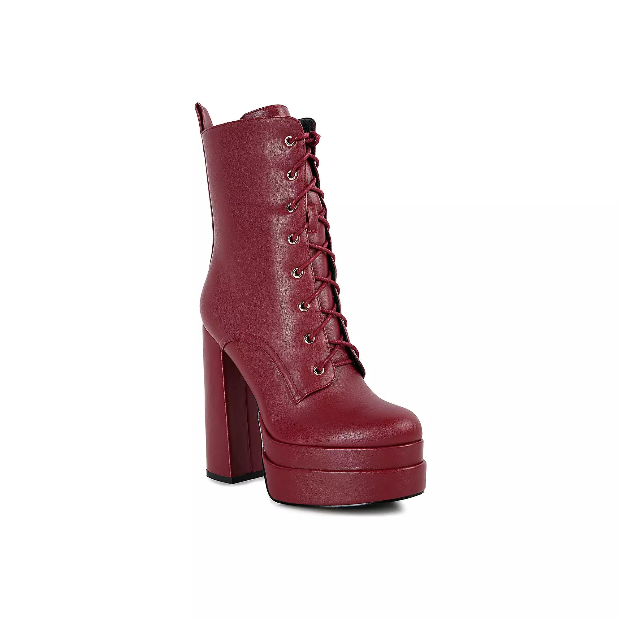 Step into stylish look with these London Rag Meows women's platform ankle boots. Click this FOOTWEAR GUIDE to find the perfect fit and more! - https://www.kohls.com/feature/shoesizeguide.jsp. SHOE FEATURES: Side zipper for easy on and off, Tall block heel and platform for added height. SHOE CONSTRUCTION: Faux leather upper, Polyester lining, Polyurethane midsole, TPR outsole. SHOE DETAILS: Round toe, Lace-up and zipper closure, Padded footbed, 4.6-in. heel, 1-in. platform, 5.9-in. shaft, 10.5-in. circumference, Spot clean, Imported. Size: 7. Color: Burgundy. Gender: female. Age Group: adult. Material: OTHER MATERIAL.