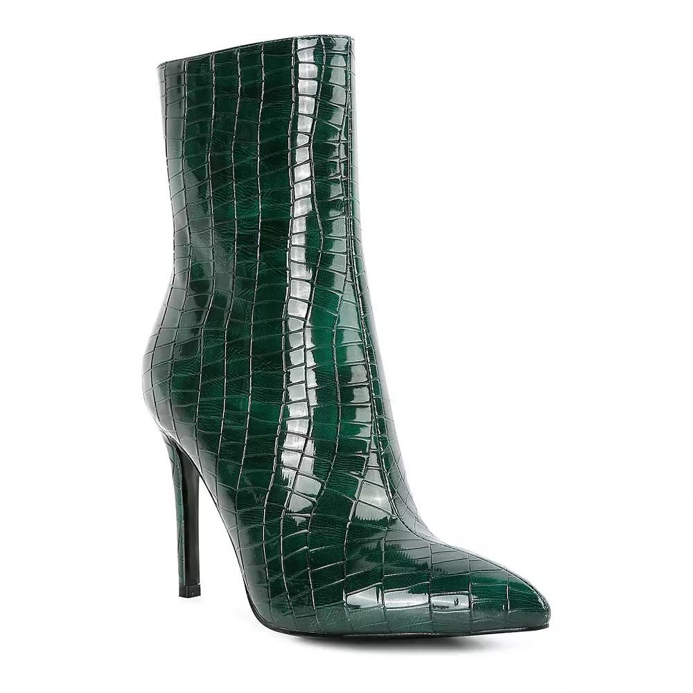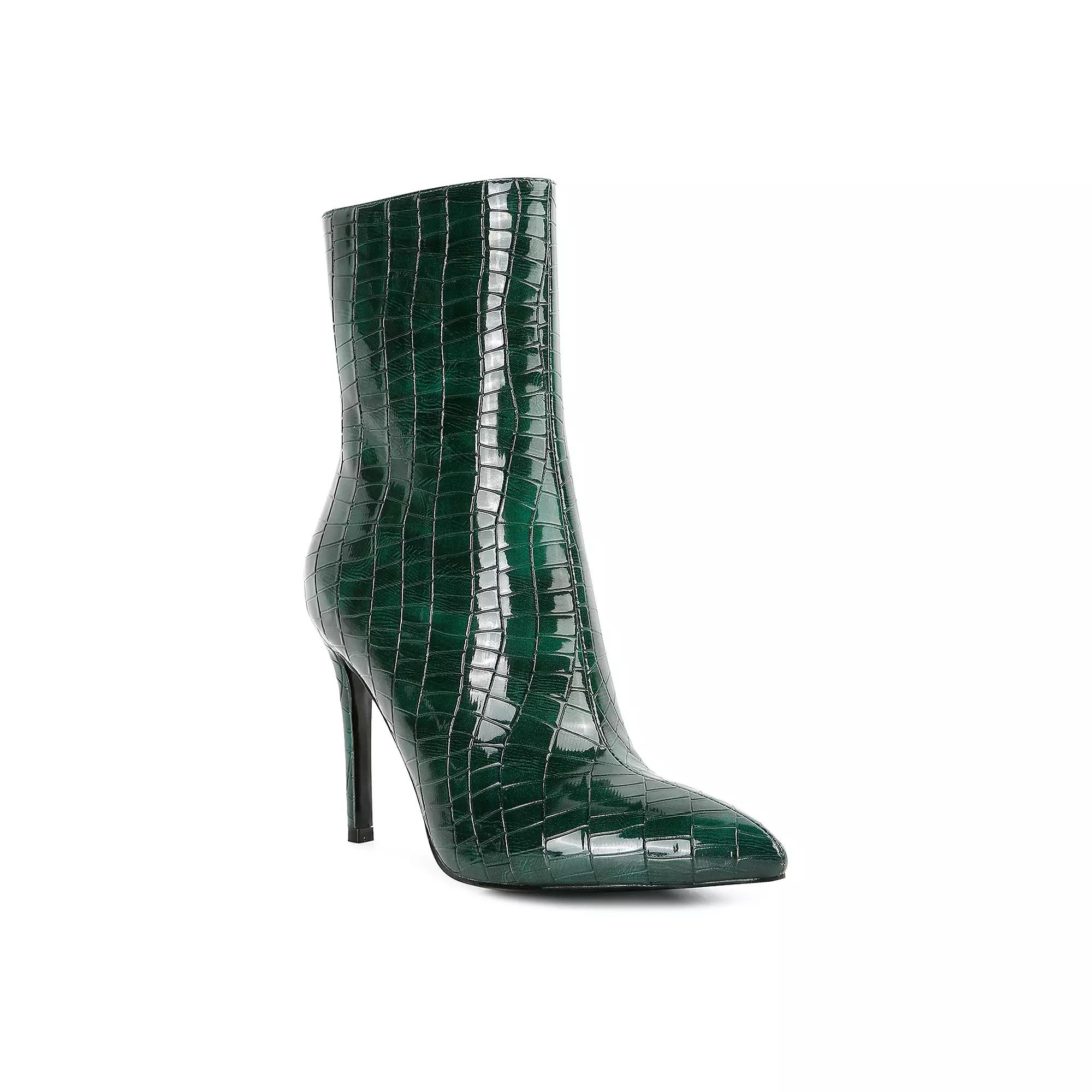 Step into chic style with these London Rag Momoa women's heeled ankle boots. Click this FOOTWEAR GUIDE to find the perfect fit and more! - https://www.kohls.com/feature/shoesizeguide.jsp. SHOE FEATURES: Croco embossed design, Stiletto heel. SHOE CONSTRUCTION: Polyurethane upper, Polyester lining, Polyurethane midsole, TPR outsole. SHOE DETAILS: Pointed toe, Zipper closure, Padded footbed, 3-in. heel, 4.6-in. shaft, 8.56-in. circumference, Spot clean, Imported. Color: Dk Green. Gender: female. Age Group: adult. Material: PATENT.