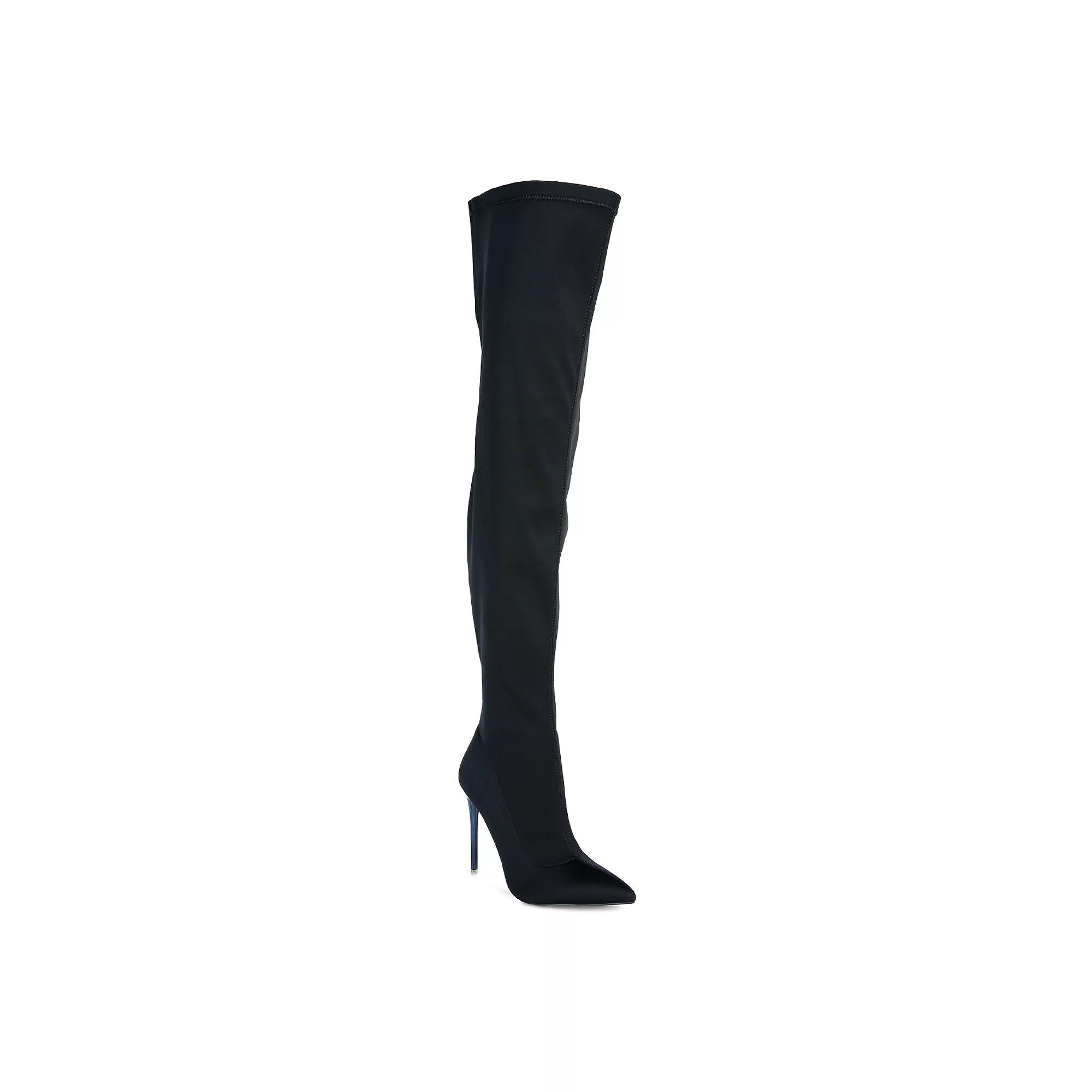 Grab the attention of the room with these bold London Rag No Calm superstretch knee high stiletto boots. Click this FOOTWEAR GUIDE to find the perfect fit and more! - https://www.kohls.com/feature/shoesizeguide.jsp. SHOE FEATURES: Knee-high stiletto design, Superstretch construction, Durable rubber outsole, Zipper closure for a secure fit. SHOE CONSTRUCTION: Lycra upper, Polyester lining, Polyurethane midsole, TPR outsole. SHOE DETAILS: Pointed toe, Zipper closure, Padded footbed, 3.75-in. heel height, 0.39-in. platform height, 21.929-in. shaft, 15.63-in. circumference, Spot clean, Imported. Color: Black. Gender: female. Age Group: adult. Material: SYNTHETIC.