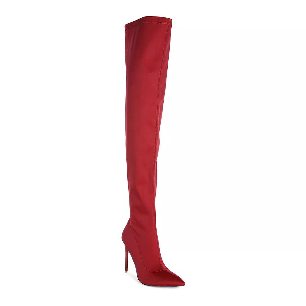 Grab the attention of the room with these bold London Rag No Calm superstretch knee high stiletto boots. Click this FOOTWEAR GUIDE to find the perfect fit and more! Grab the attention of the room with these bold London Rag No Calm superstretch knee high stiletto boots. Click this FOOTWEAR GUIDE to find the perfect fit and more! SHOE FEATURES Knee-high stiletto design Superstretch construction Durable rubber outsole Zipper closure for a secure fitSHOE CONSTRUCTION Lycra upper Polyester lining Polyurethane midsole TPR outsoleSHOE DETAILS Pointed toe Zipper closure Padded footbed 3.75-in. heel height 0.39-in. platform height 21.929-in. shaft 15.63-in. circumference Spot clean Imported Size: 10. Color: Dark Red. Gender: female. Age Group: adult.