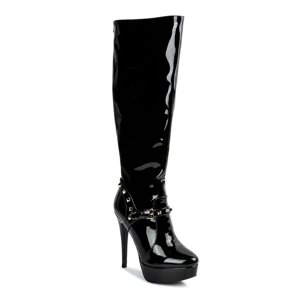 Versace Jeans Couture black knee-high boots with 8 cm stiletto heel, side zip fastening and baroque buckle detail, elongated toe with logoed metal plaque.