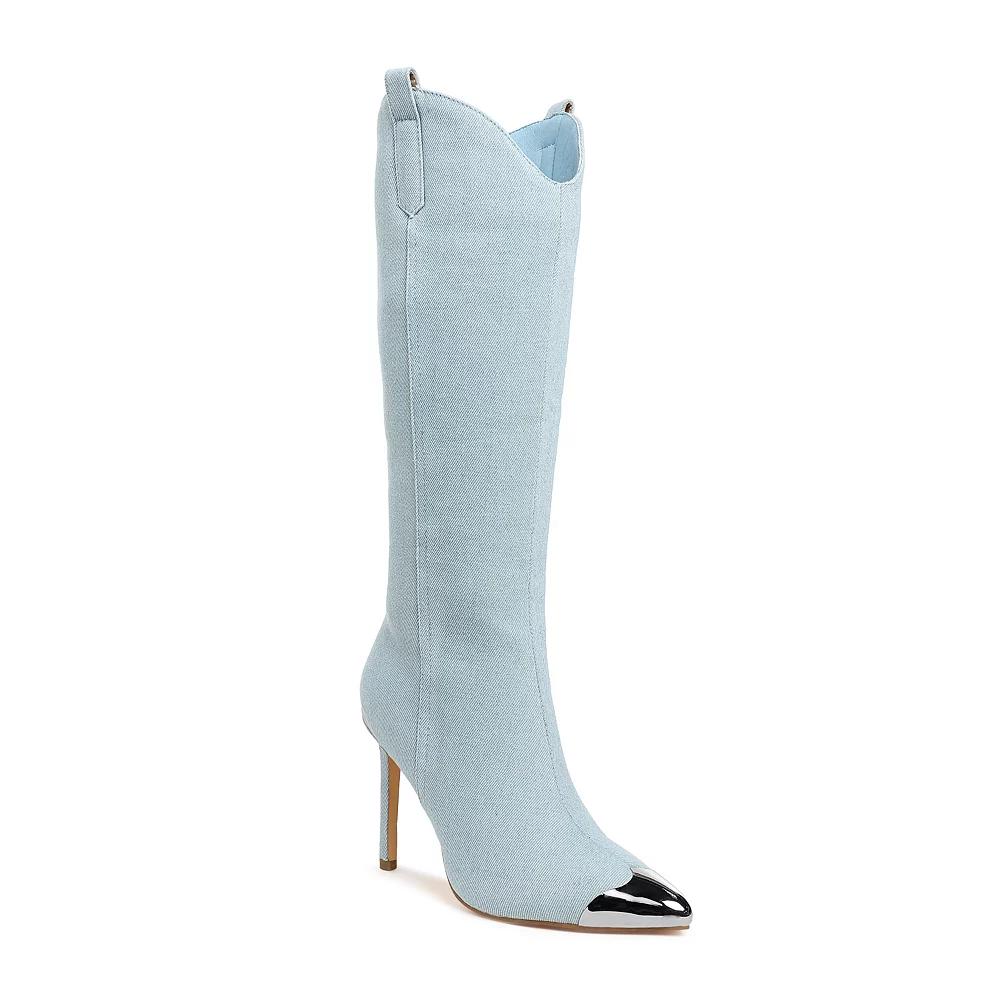 Unleash your inner fashionista with these eye-catching pointed boots that combine edgy style with undeniable flair. London Rag delivers a striking metallic cap toe that adds a bold statement to any outfit, making them the perfect choice for both casual outings and nights out on the town. Click this FOOTWEAR GUIDE to find the perfect fit and more! - https://www.kohls.com/feature/shoesizeguide.jsp. FEATURES: Metallic accents. DETAILS: Zipper closure, Slip-resistant outsole, Pointed toe, 4-in. heel, 0.75-in. platform, Imported. FIT & SIZE: Mid-calf boot shaft, 15.5-in. shaft height, 9.5-in. shaft circumference. MATERIAL & CARE: Denim upper, TPR outsole, Polyurethane lining, midsole and footbed, Spot clean. Size: 6.5. Color: Blue. Gender: female. Age Group: adult. Material: SYNTHETIC.