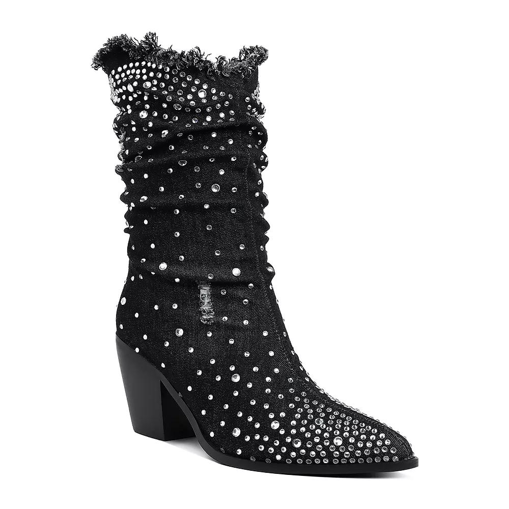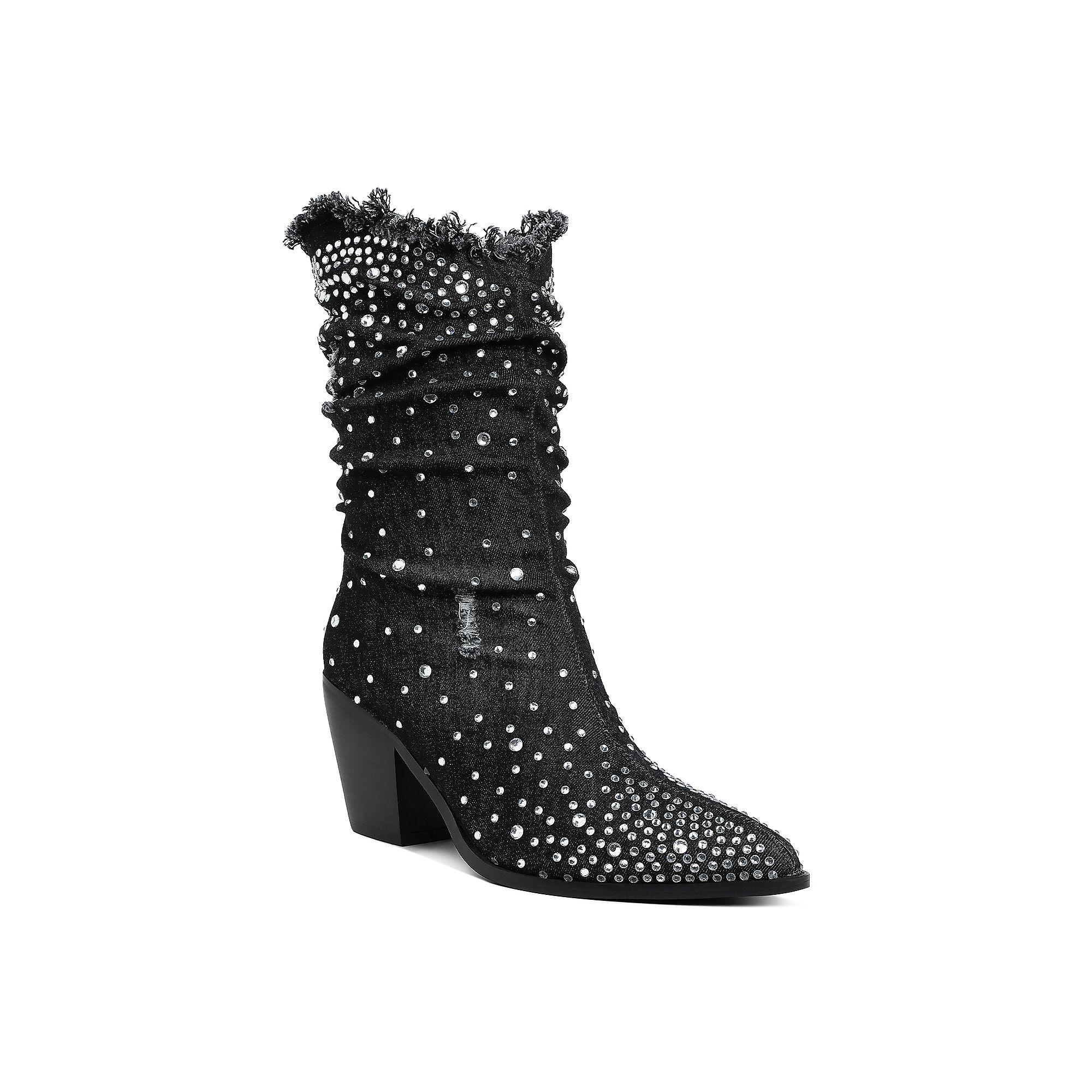 Add a touch of glamour to your footwear collection with these pointed denim boots, beautifully adorned with diamante rhinestones. Perfect for making a statement, these London Rag boots effortlessly blend style and edge, ensuring you stand out whether you're out on the town or enjoying a casual day out. Click this FOOTWEAR GUIDE to find the perfect fit and more! - https://www.kohls.com/feature/shoesizeguide.jsp. FEATURES: Rhinestone accents. DETAILS: Zipper closure, Slip-resistant outsole, Pointed toe, 2.5-in. heel, 0.75-in. platform, Imported. FIT & SIZE: Mid-calf boot shaft, 9.5-in. shaft height, 8.5-in. shaft circumference. MATERIAL & CARE: Denim upper, TPR outsole, Polyurethane lining, midsole and lining, Polyurethane footbed, Spot clean. Size: 7.5. Color: Black. Gender: female. Age Group: adult. Material: SYNTHETIC.