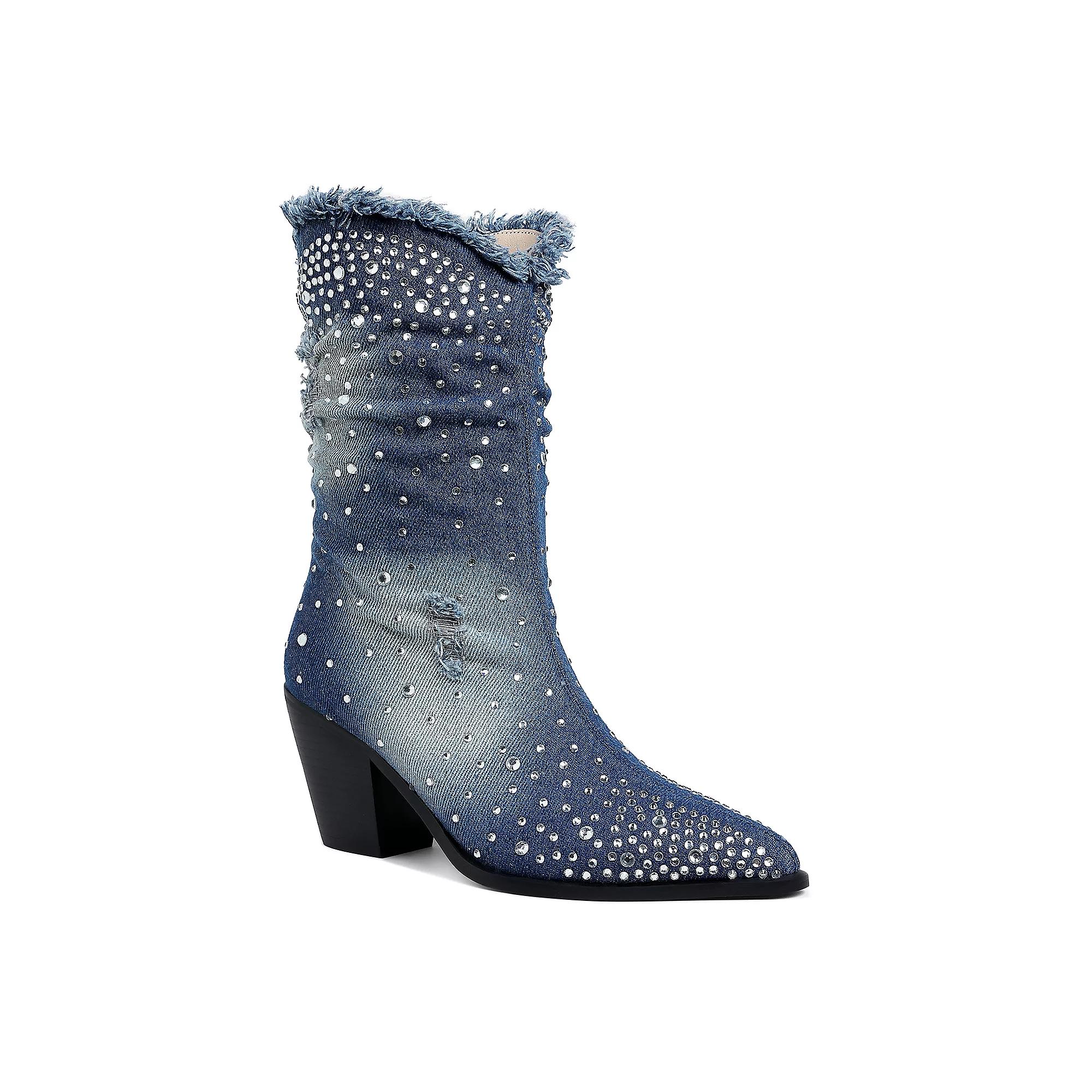 Add a touch of glamour to your footwear collection with these pointed denim boots, beautifully adorned with diamante rhinestones. Perfect for making a statement, these London Rag boots effortlessly blend style and edge, ensuring you stand out whether you're out on the town or enjoying a casual day out. Click this FOOTWEAR GUIDE to find the perfect fit and more! - https://www.kohls.com/feature/shoesizeguide.jsp. FEATURES: Rhinestone accents. DETAILS: Zipper closure, Slip-resistant outsole, Pointed toe, 2.5-in. heel, 0.75-in. platform, Imported. FIT & SIZE: Mid-calf boot shaft, 9.5-in. shaft height, 8.5-in. shaft circumference. MATERIAL & CARE: Denim upper, TPR outsole, Polyurethane lining, midsole and lining, Polyurethane footbed, Spot clean. Size: 6. Color: Dark Blue. Gender: female. Age Group: adult. Material: SYNTHETIC.