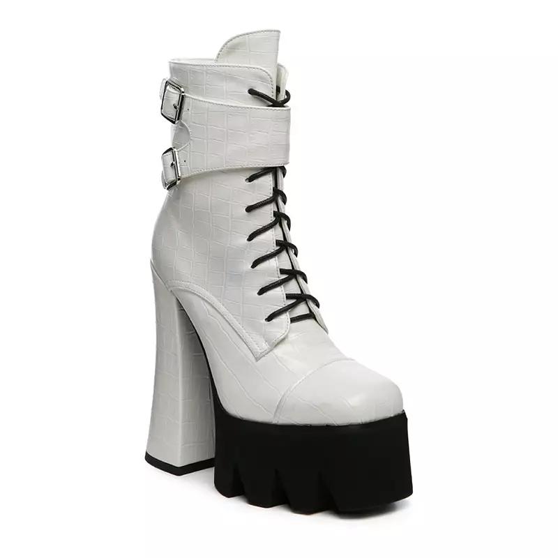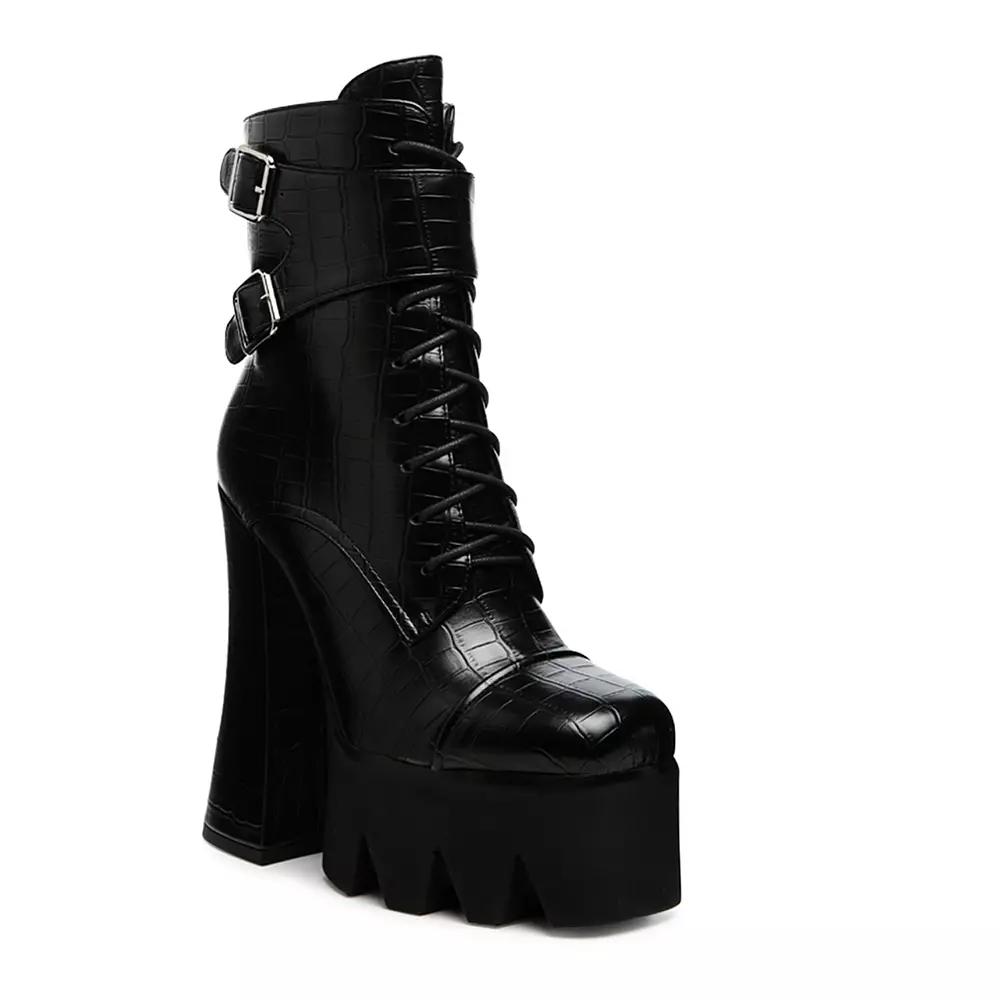 Look captivatingly edgy in the Stomper combat boot from London Rag. The croc patterned upper, sky high heel and buckle details inspire trendy styling and looks.