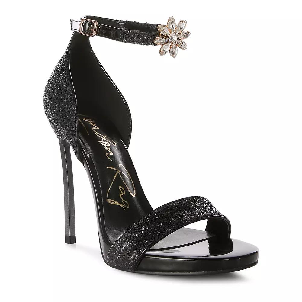Make a shining fashion statement wearing these womens glitter high sandals from London Rag. Click this FOOTWEAR GUIDE to find the perfect fit and more! Make a shining fashion statement wearing these womens glitter high sandals from London Rag. Click this FOOTWEAR GUIDE to find the perfect fit and more! SHOE FEATURES Lightly cushioned insole Glitter accents Floral jewel detail Sleek stiletto heelSHOE CONSTRUCTION Synthetic upper Polyester lining TPR outsole Polyurethane midsoleSHOE DETAILS Open toe Pin buckle closure 0.39-in. platform height Polyurethane footbed Spot clean Imported Size: 5. Color: Black. Gender: female. Age Group: adult.