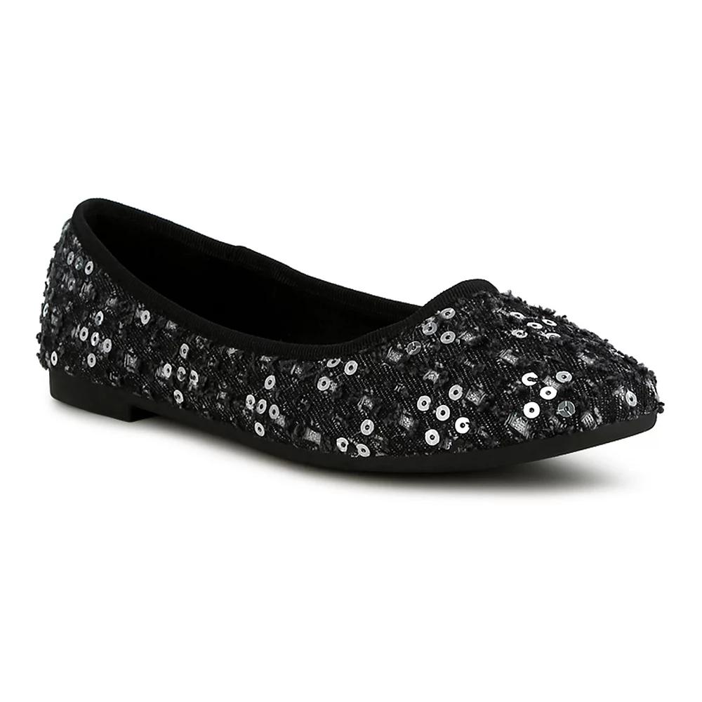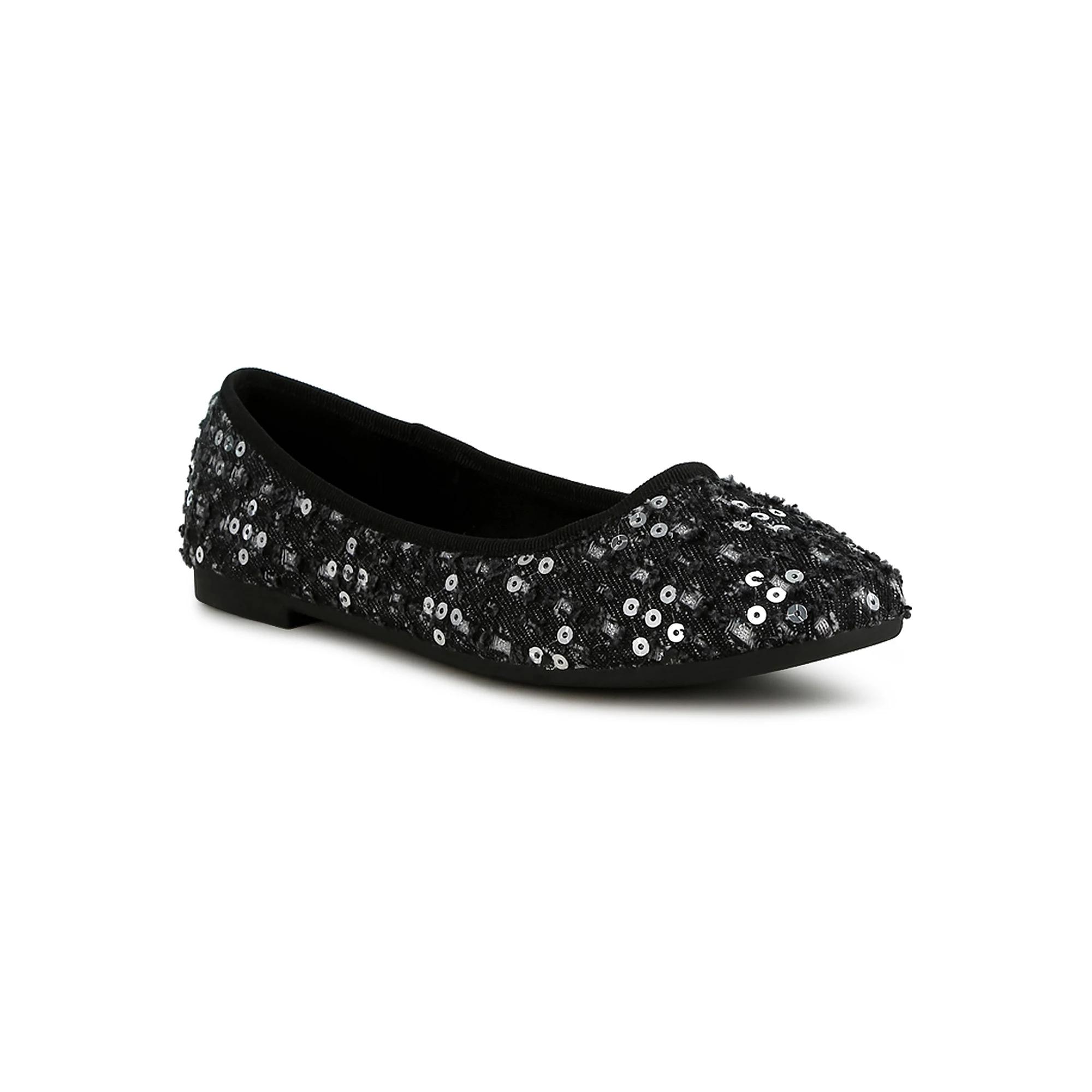 Style and comfort come hand-in-hand with these London Rag Sujet Sequin Womens Ballet Flats. Click this FOOTWEAR GUIDE to find the perfect fit and more! SHOE CONSTRUCTION Glitter fabric upper Polyurethane lining Polyurethane midsole TPR outsoleSHOE DETAILS Pointed toe Slip-on Polyurethane footbed Slip-resistant outsole 0.39-in. heel 0.39-in. platform Spot clean Imported Size: 5. Color: Black. Gender: female. Age Group: adult.