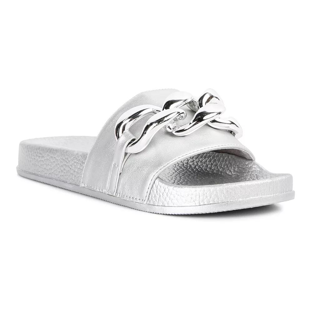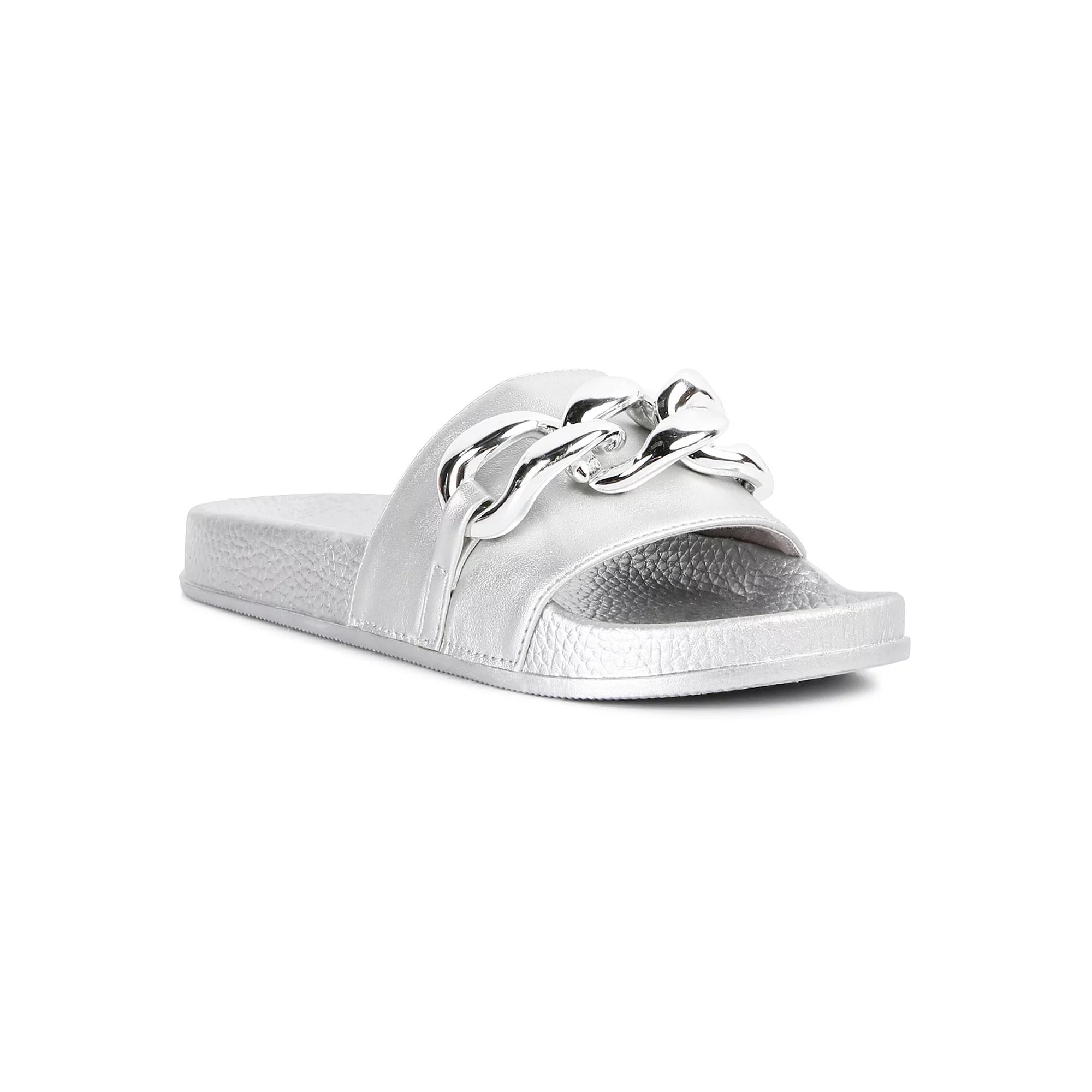 London Rag Women's Ishtar Metallic Chain Metal Slide Sandals,
