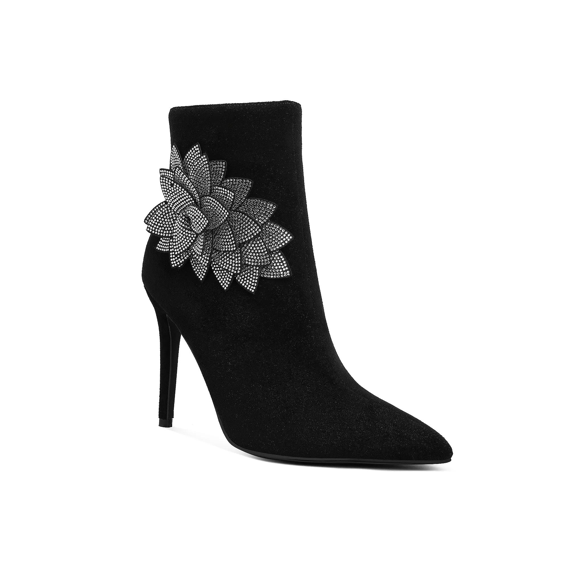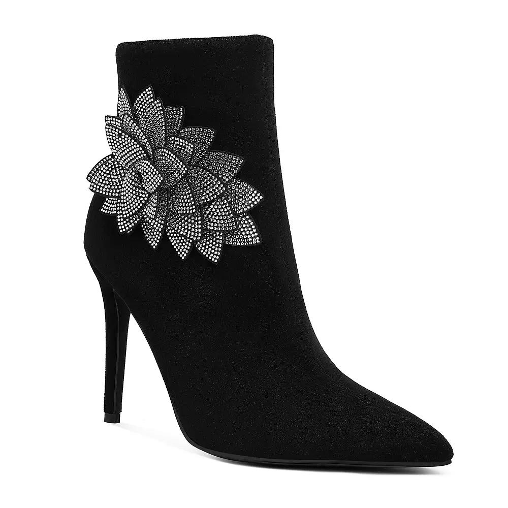 Unleash your inner fashionista with these stunning pointed boots adorned with exquisite rhinestones and delicate petal details. Perfect for elevating any outfit, from casual jeans to elegant dresses, these London Rag boots combine striking style with undeniable versatility, making them a must-have for your shoe collection. Click this FOOTWEAR GUIDE to find the perfect fit and more! - https://www.kohls.com/feature/shoesizeguide.jsp. DETAILS: Zipper closure, Slip-resistant outsole, Pointed toe, 4-in. heel, 0.75-in. platform, Imported. FIT & SIZE: Mid-calf boot shaft, 8.5-in. shaft height, 8.5-in. shaft circumference. MATERIAL & CARE: Microfiber upper, TPR outsole, Polyurethane lining, midsole and footbed, Spot clean. Color: Black. Gender: female. Age Group: adult. Material: SYNTHETIC.