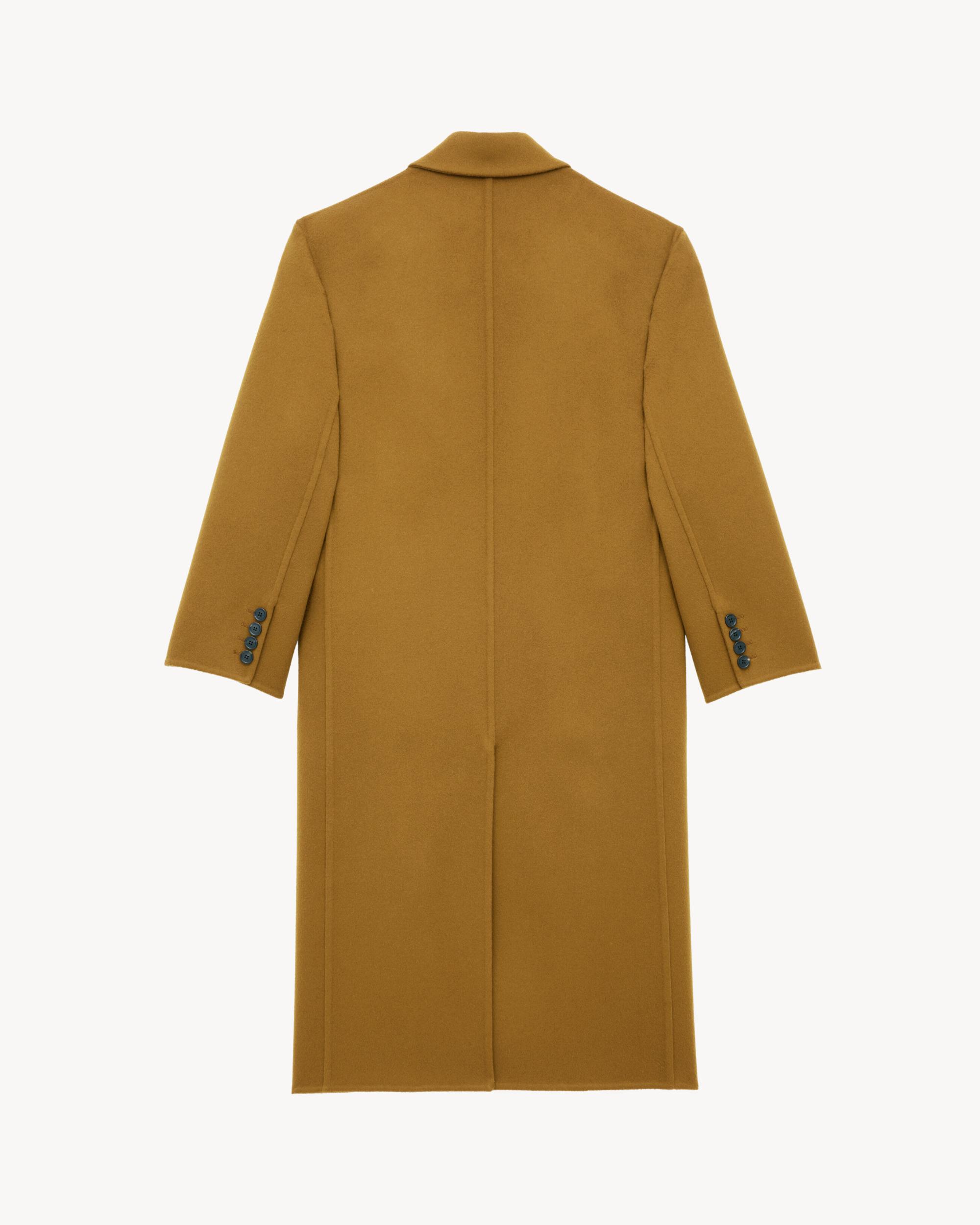 double-breasted, six-button long coat made with double-face certified wool, featuring a peaked lapel.
