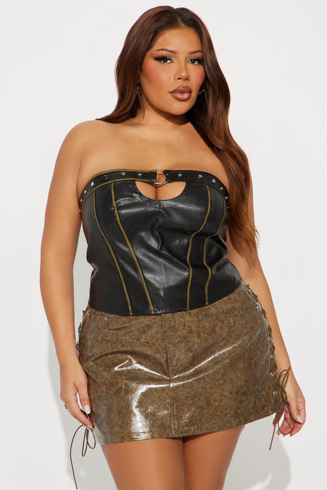 Available In Brown. Tube Up Faux Leather Cut Out Studded Detail Back Zip Closure Non Stretch Self: 100% Cotton With Polyurethane Coating Lining: 100% Polyester Imported California Proposition 65WARNING: Cancer and Reproductive Harm - www.P65Warnings.ca.gov.