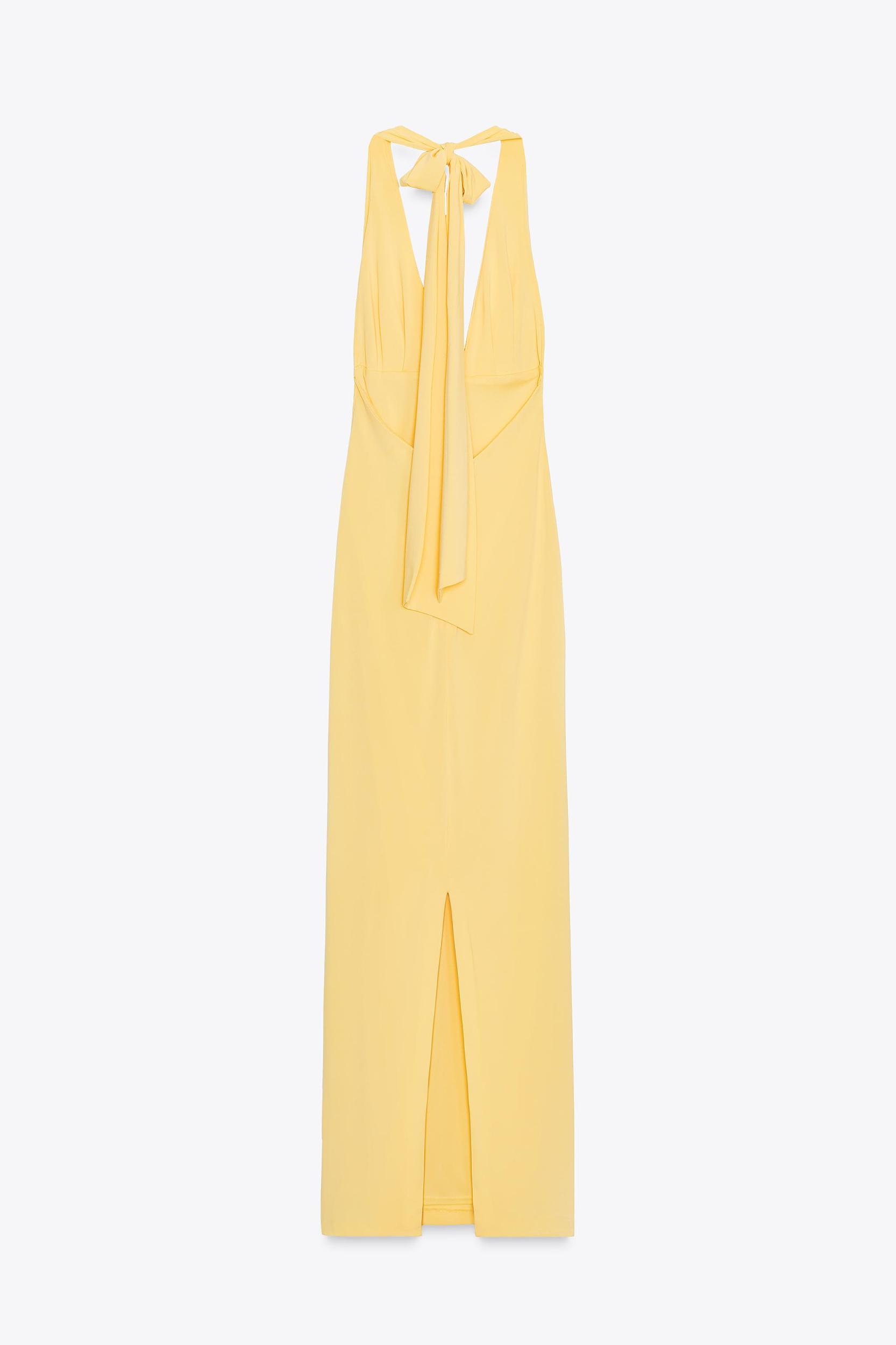Long dress made in knit fabric. Halter neck with tie and plunging neckline. Inner lining. Back hidden in-seam zip closure.