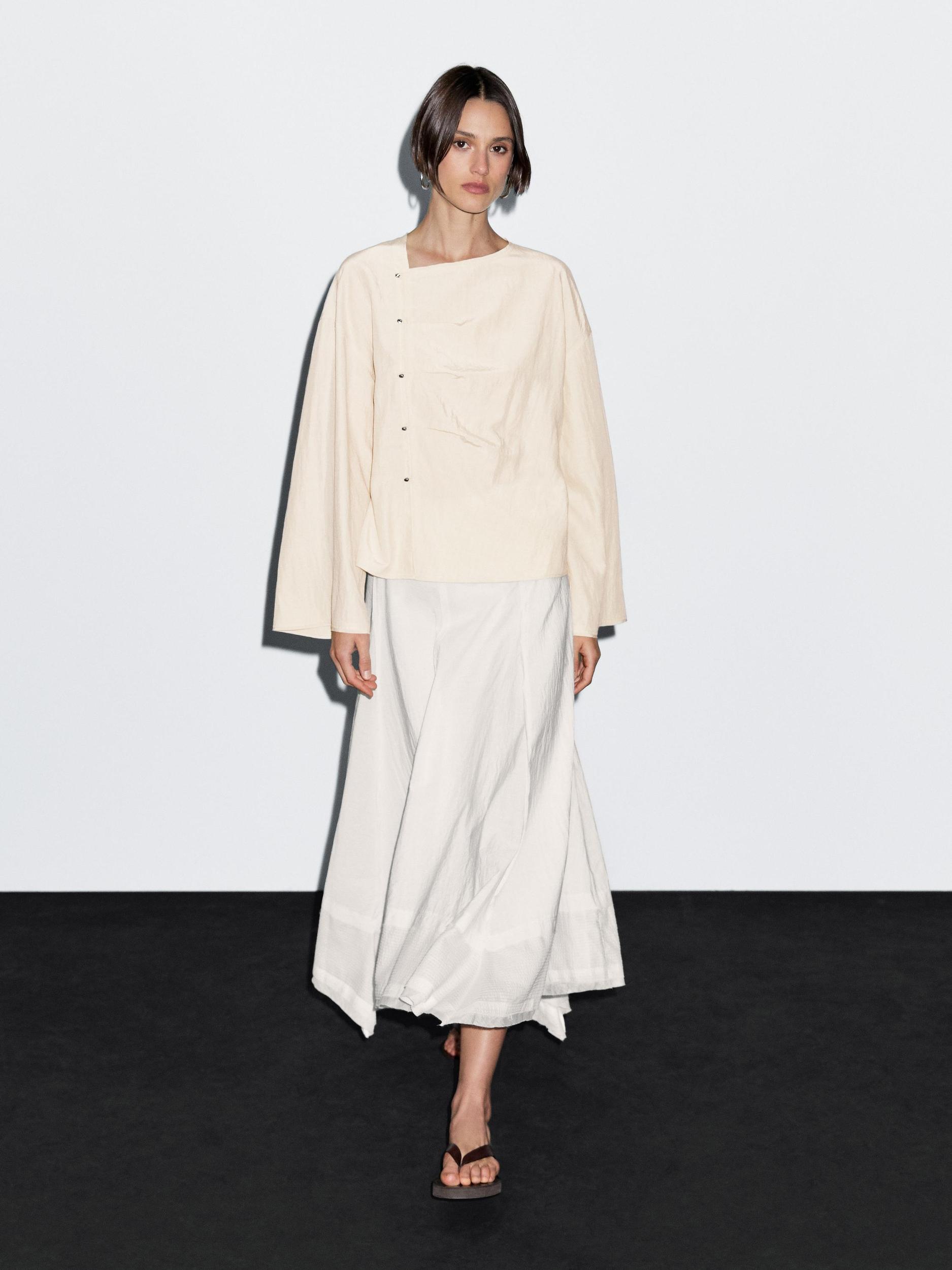 Flowing blouse, Crew neck, Wide long sleeve, Elegant silver-toned rhinestone buttons, Button fastening at the side