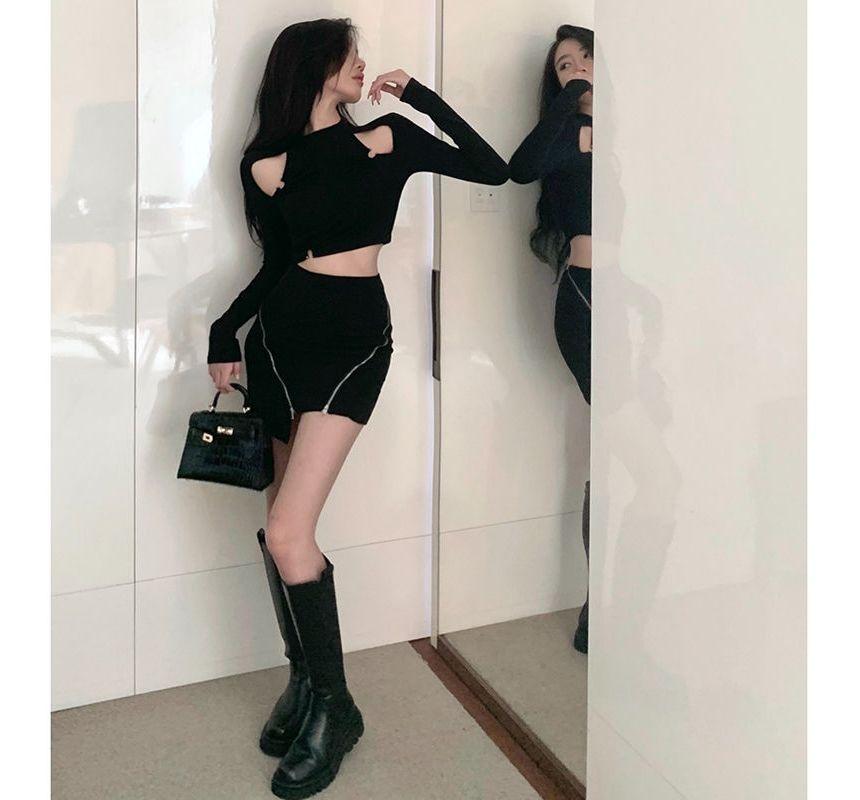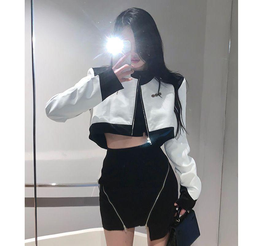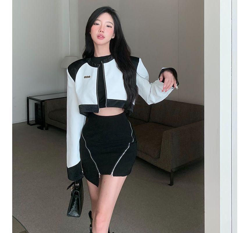Long-Sleeve Crew Neck Plain Cutout Crop Tee / High Waist Zip Asymmetrical Mini Pencil Skirt / Crew Neck Two Tone Faux Leather Crop Zip Jacket / Set