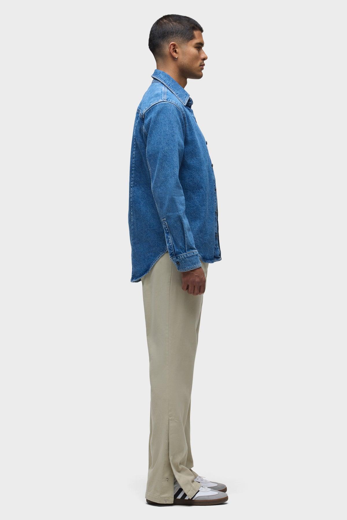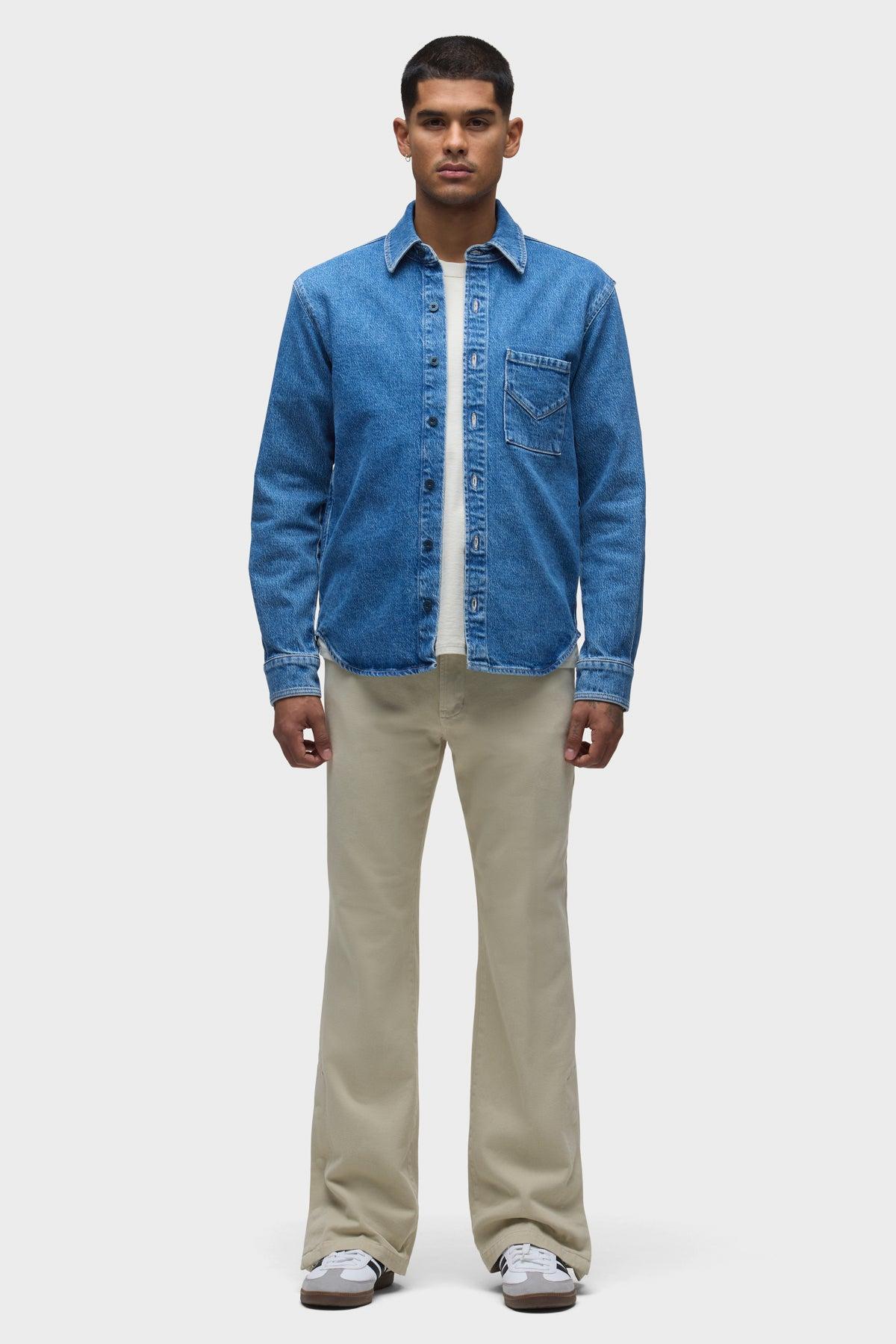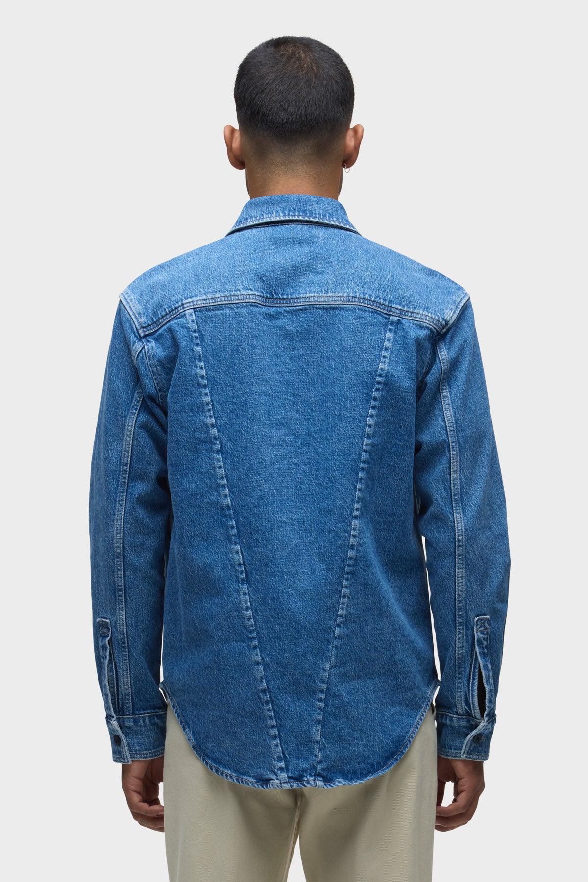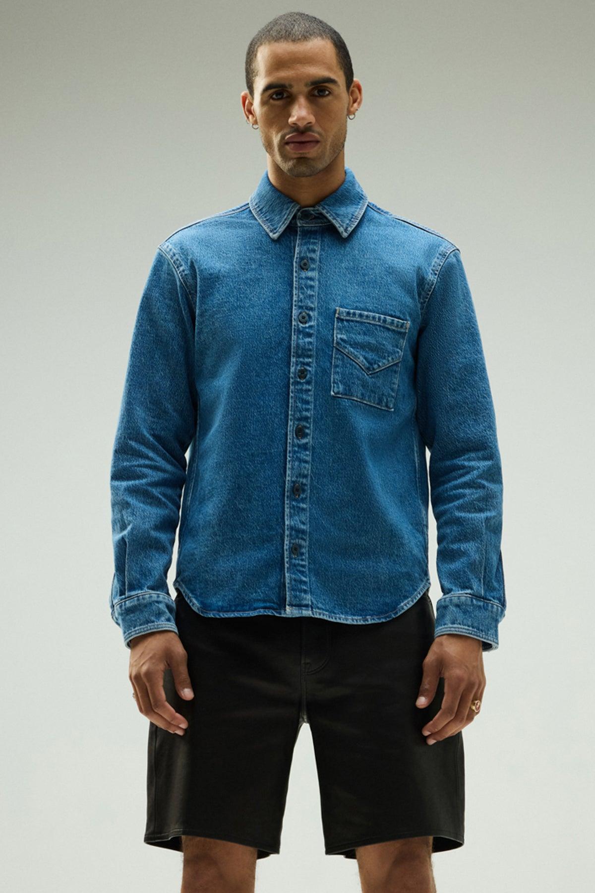 Description Our Long Sleeve Denim Shirt in Shade is designed in a medium indigo with stone washing and bleaching for an elevated look. The classic fit is finished with a straight collar, branded button front closure and our signature back "V" seam. Product Details Body Length: 29", Chest: 45.5", Sleeve Length: 24.5"Model Height 6’1"Model wearing size MMeasurements based on size M Fit & Care Content: 97% Cotton, 2% Elasterell, 1% ElastaneMachine wash cold with like colorsDo not bleachTumble dry low or hang to dry